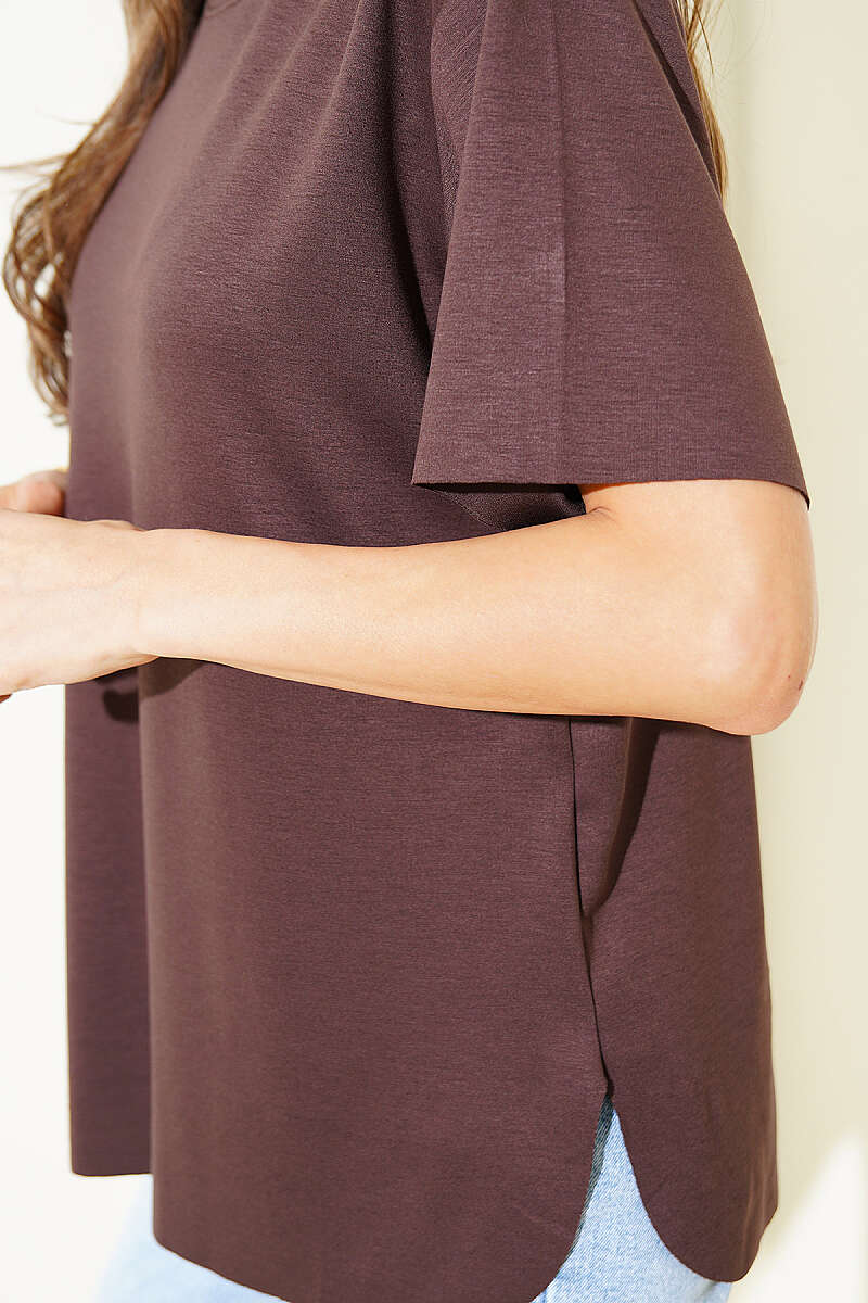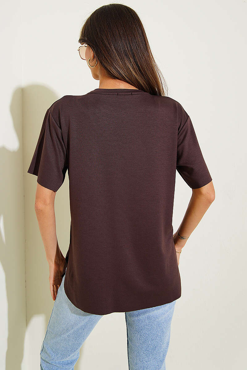Lazer Kesimli Basic T-shirt Kahve