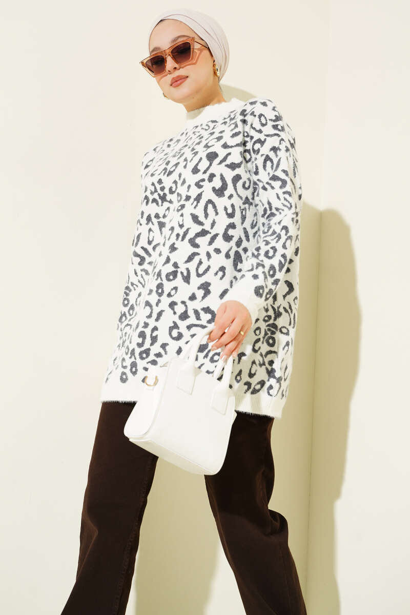 Leopar Desen Detaylı Sakallı Kazak Beyaz