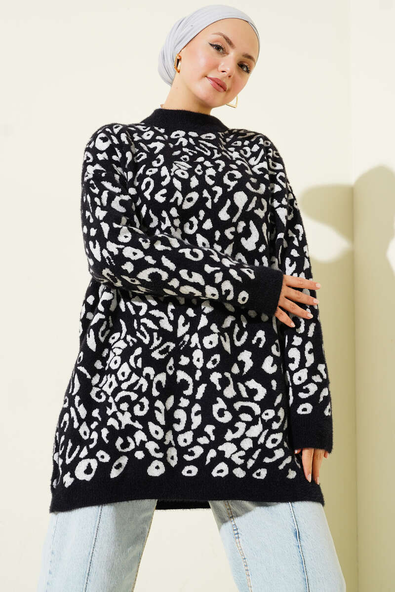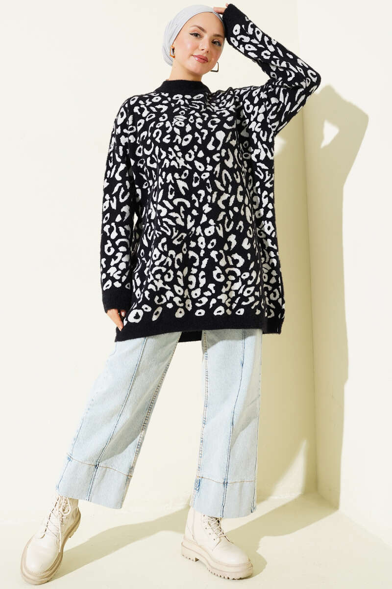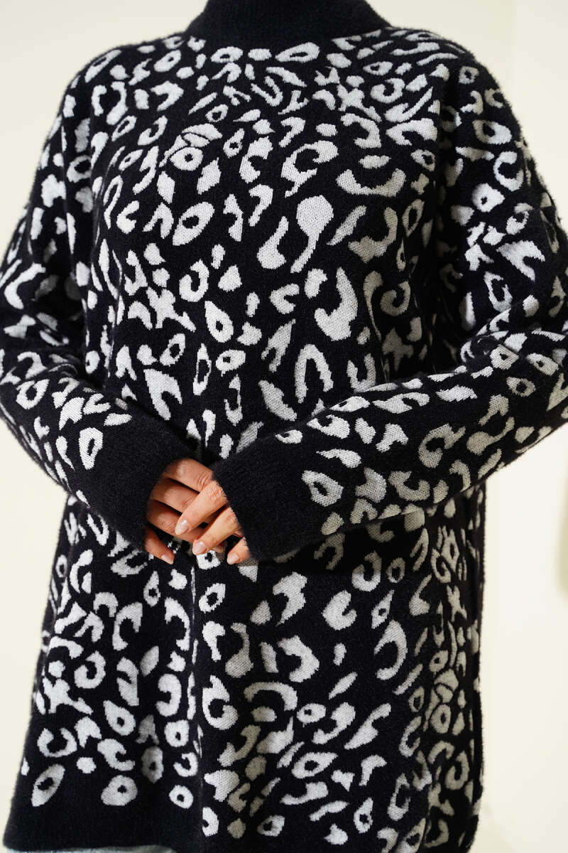 Leopar Desen Detaylı Sakallı Kazak Siyah