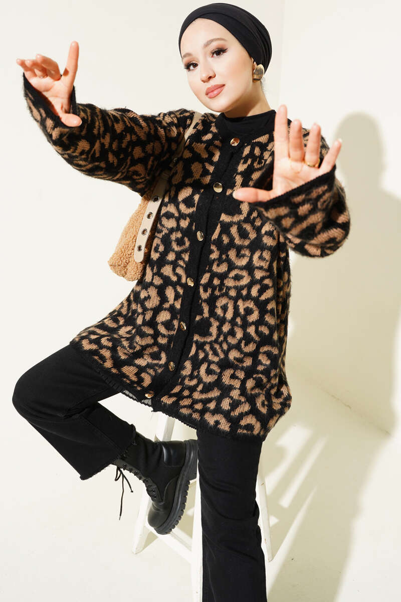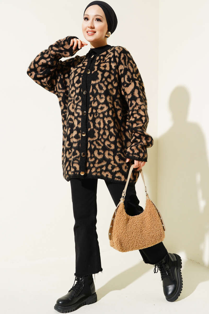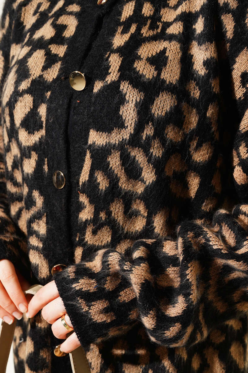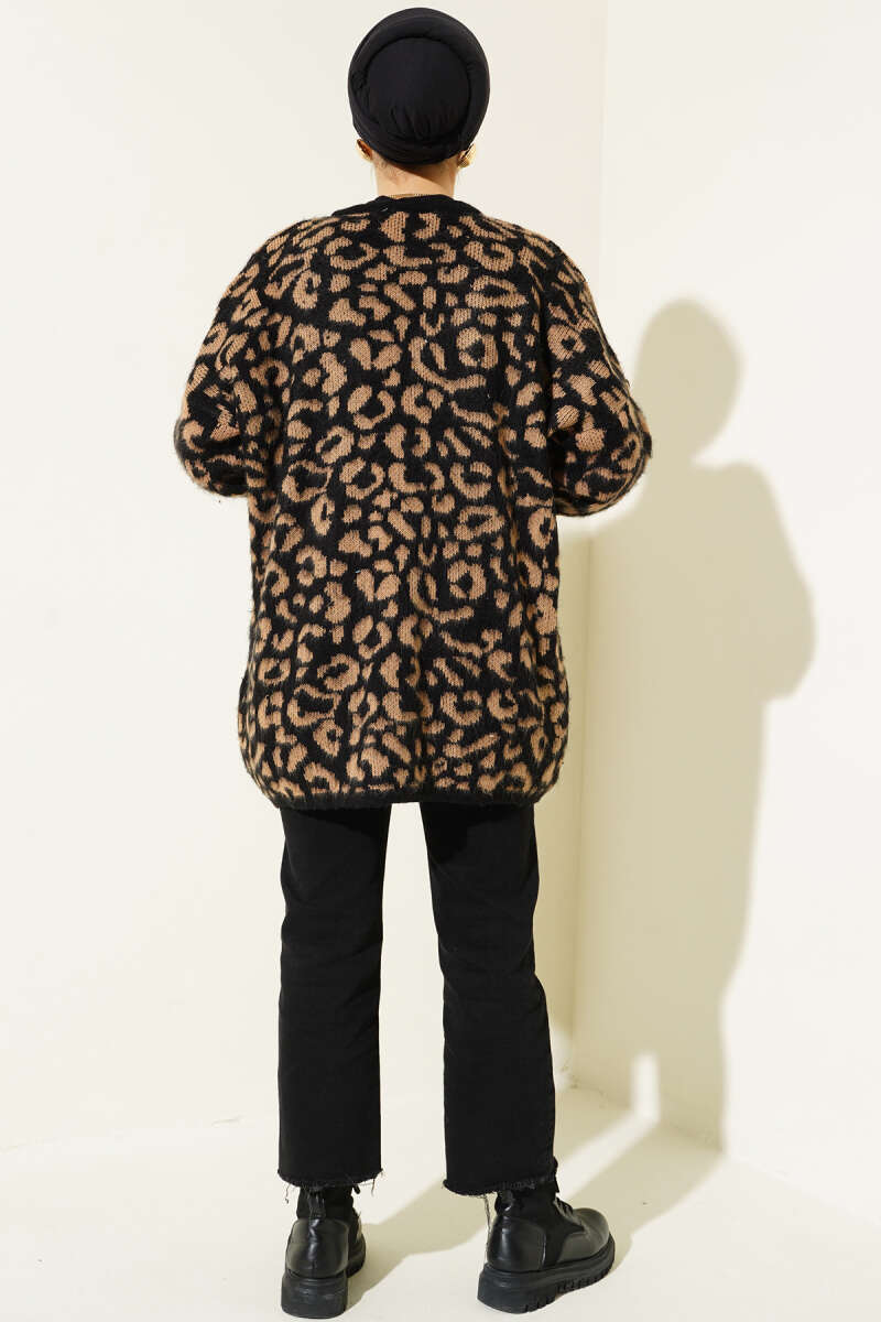 Leopar Desen Düğmeli Salaş Triko Hırka Kahve