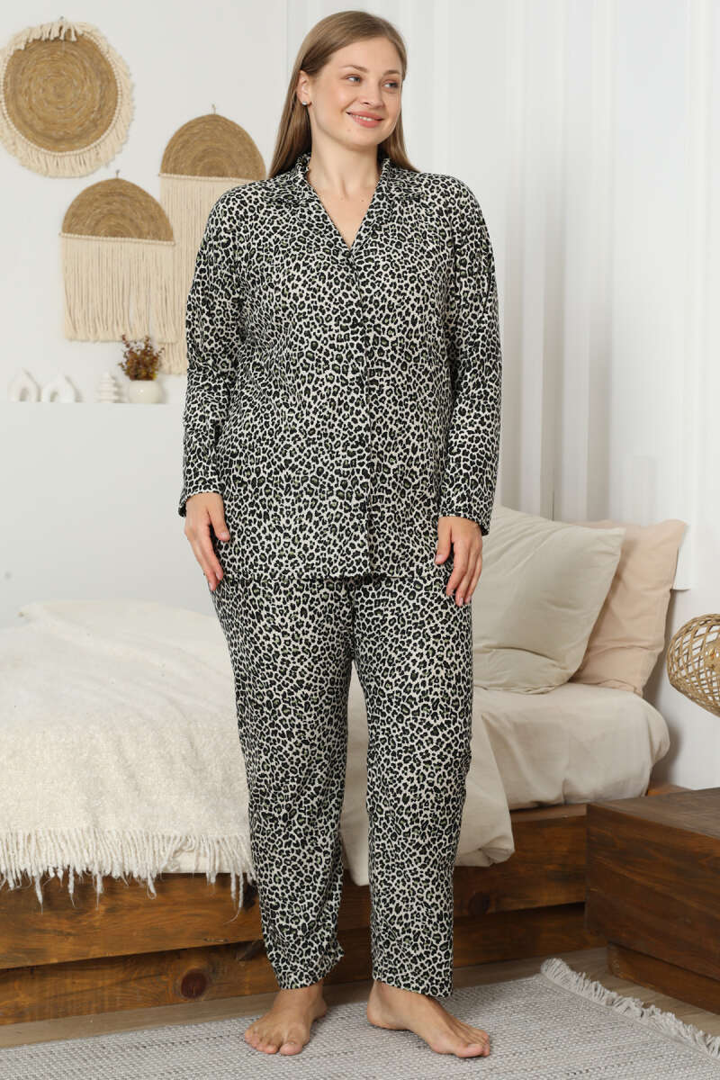 Leopar Desen Süet Büyük Beden Pijama Takım Yeşil