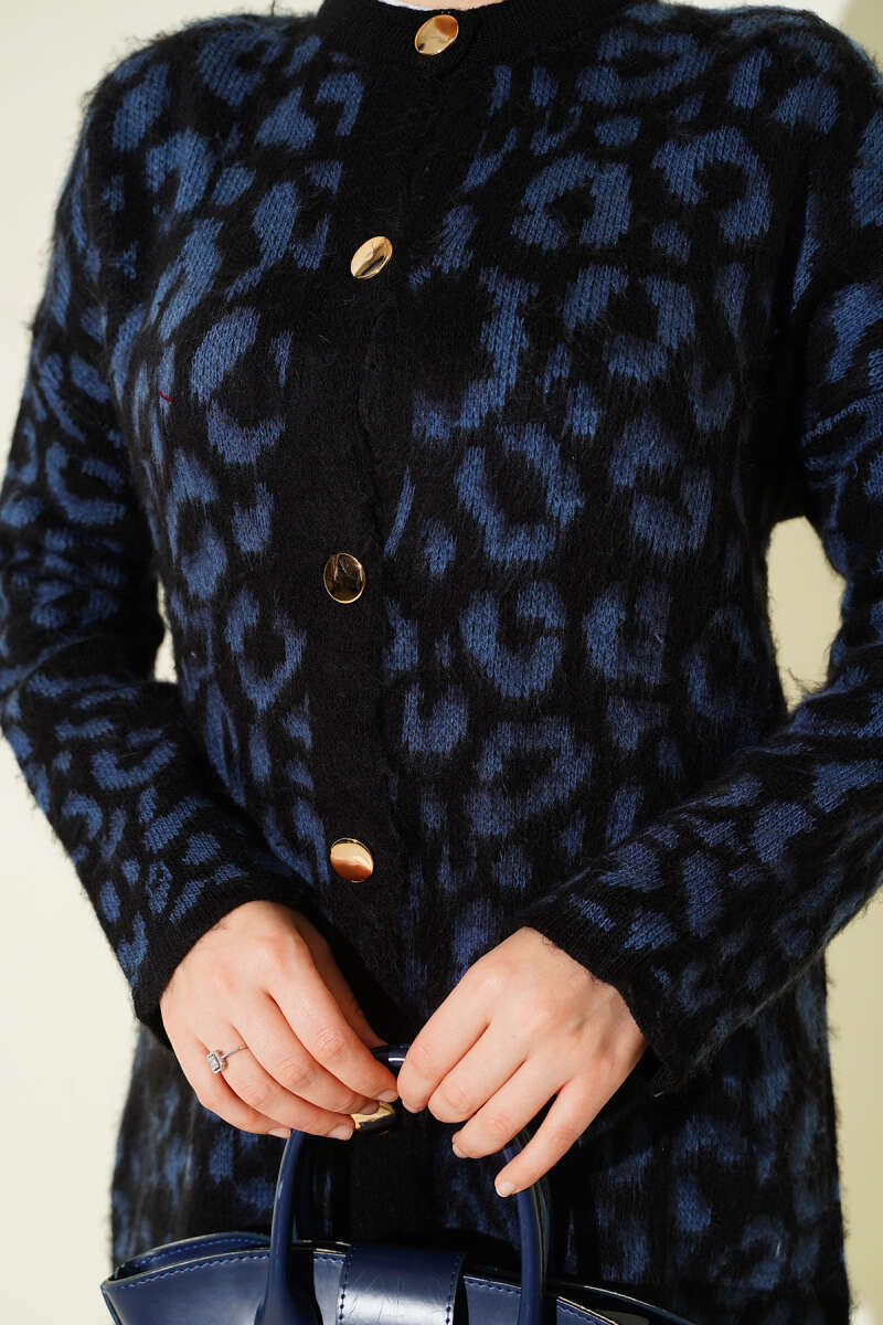 Leopar Desen Triko Düğmeli Hırka Lacivert
