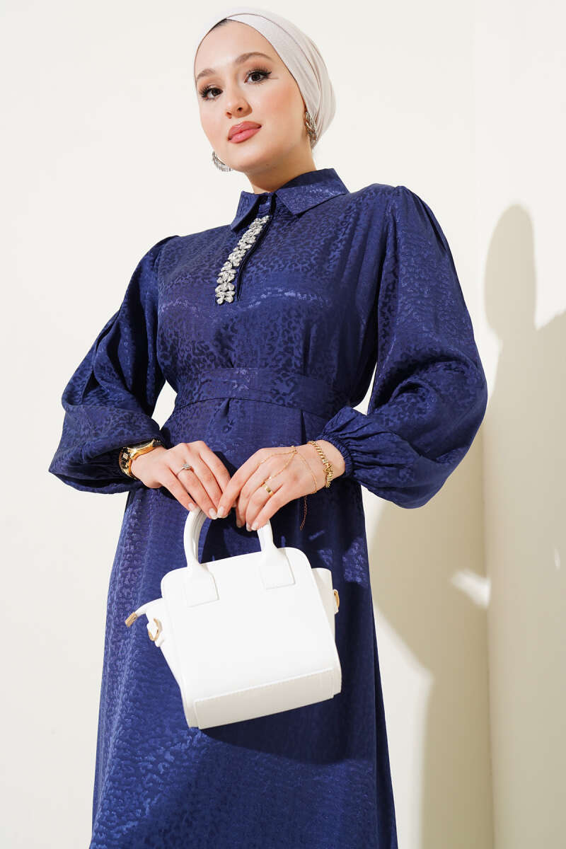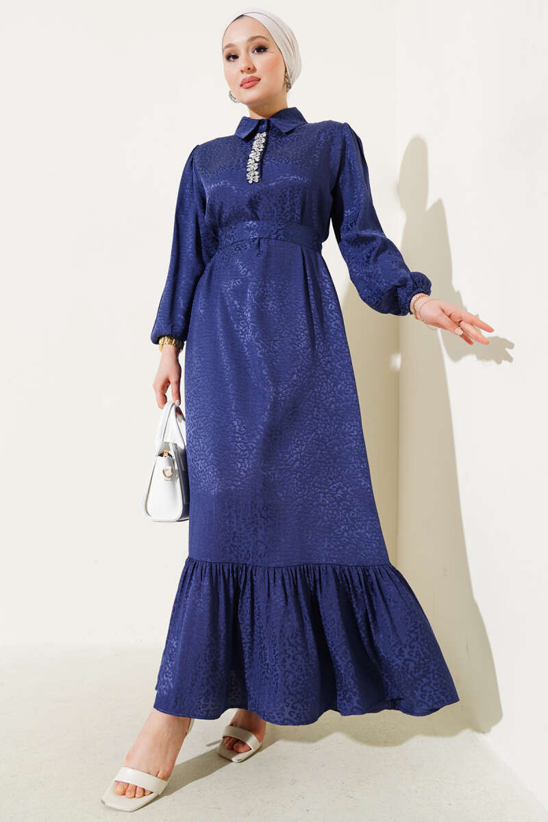 Kuşaklı Ekose Desenli Kloş Elbise Lacivert