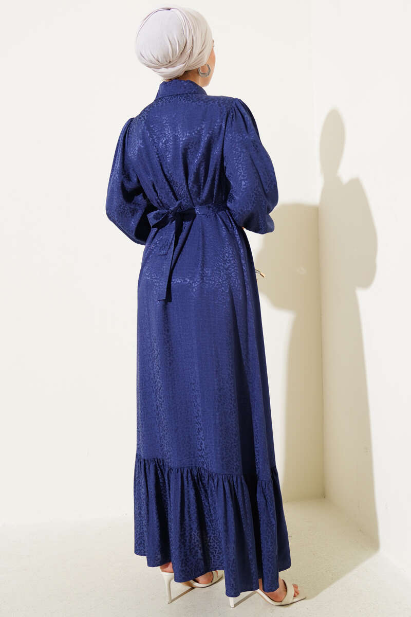 Kuşaklı Ekose Desenli Kloş Elbise İndigo