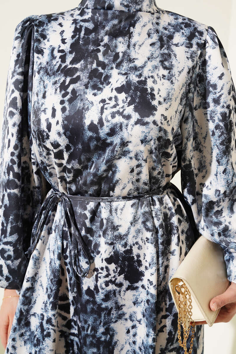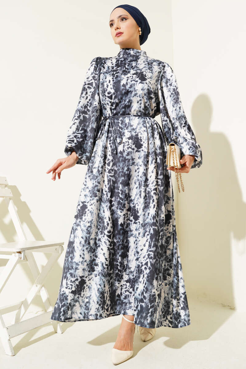 Leopar Desenli Balon Kol Saten Elbise Duman Gri