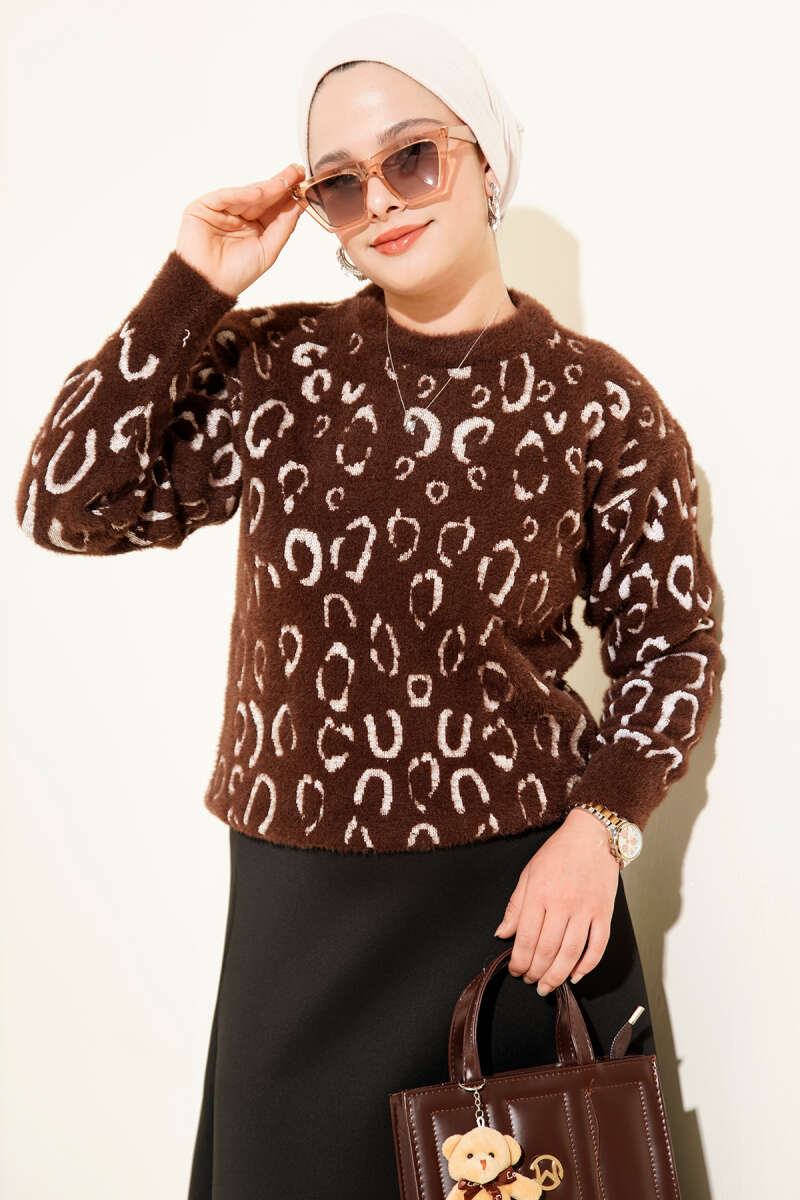 Leopar Desenli Sakallı Kazak Kahve Ekru
