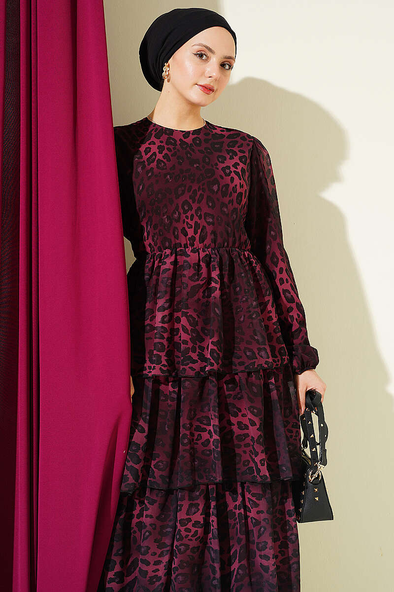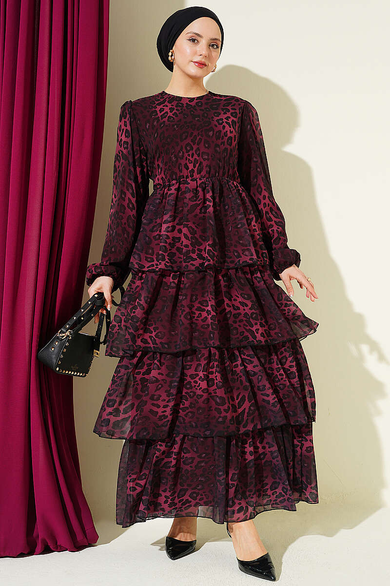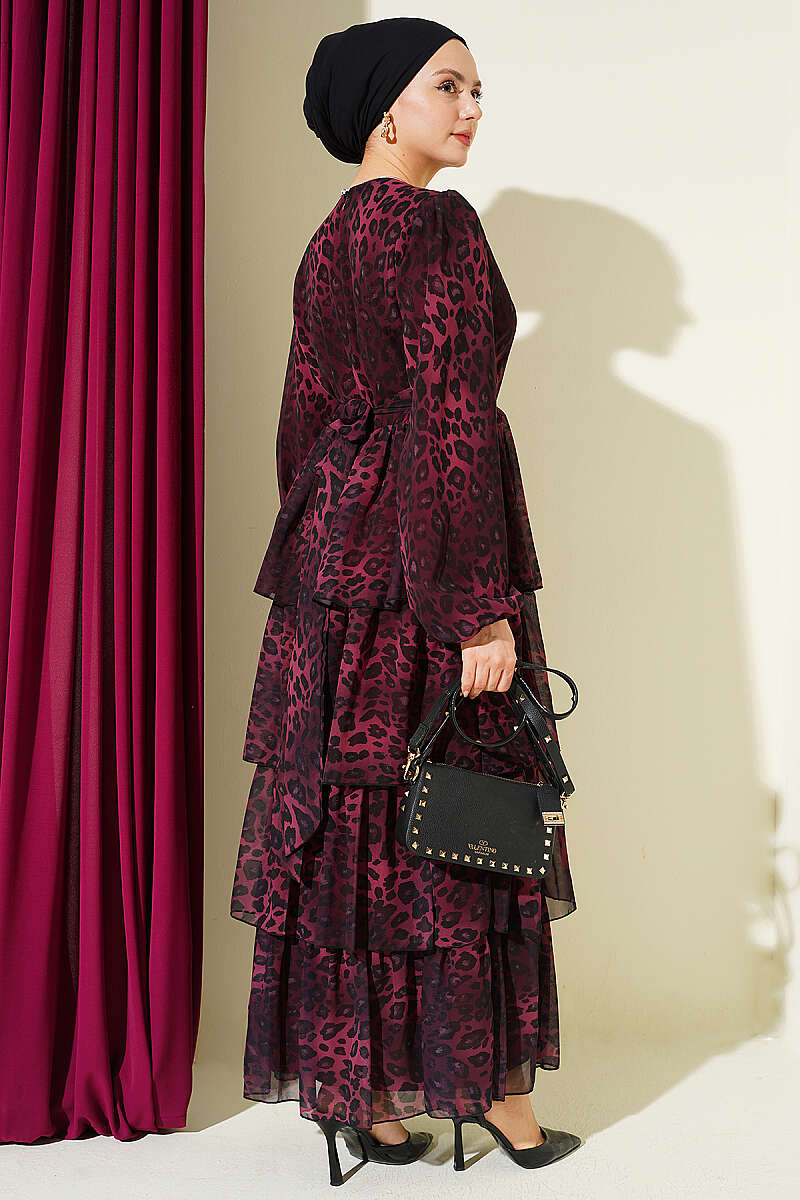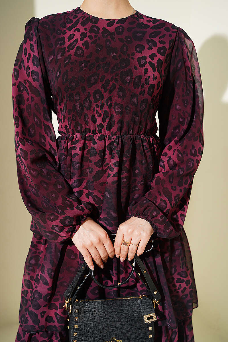 Leopar Desenli Şifon Kat Kat Elbise Bordo