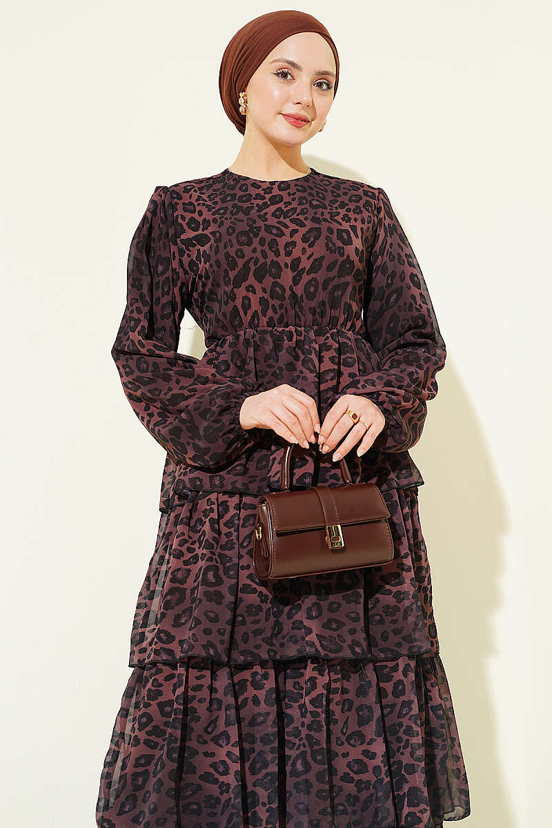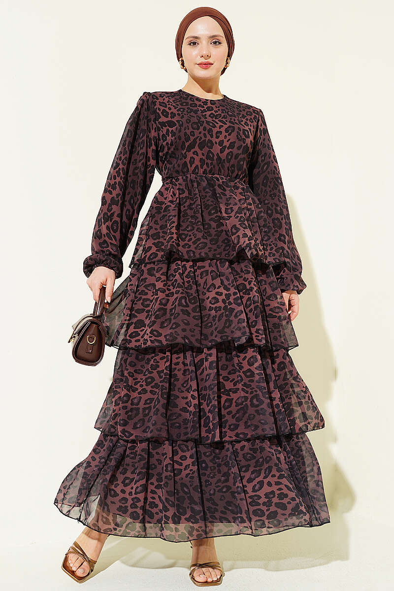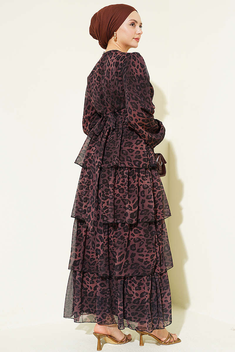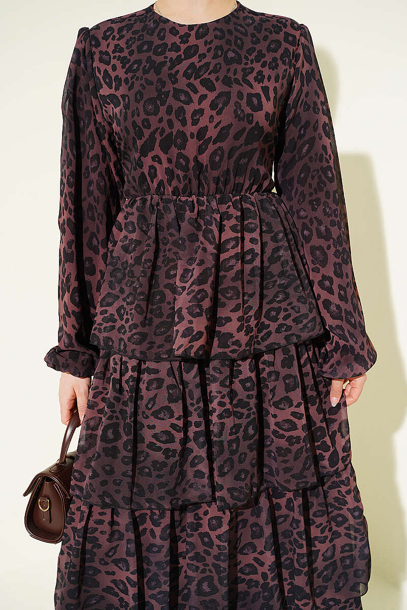 Leopar Desenli Şifon Kat Kat Elbise Kahve