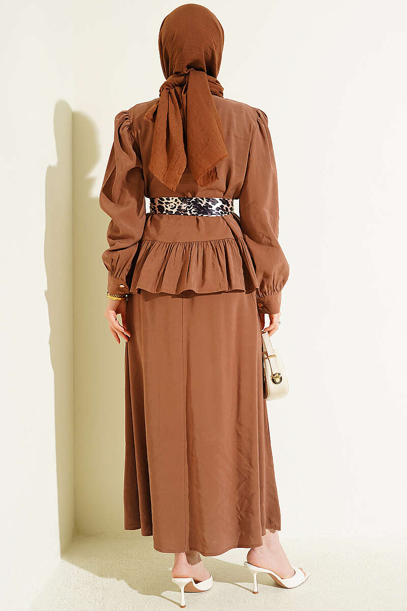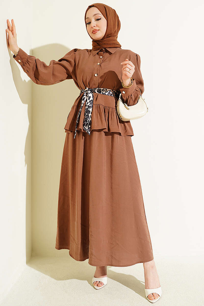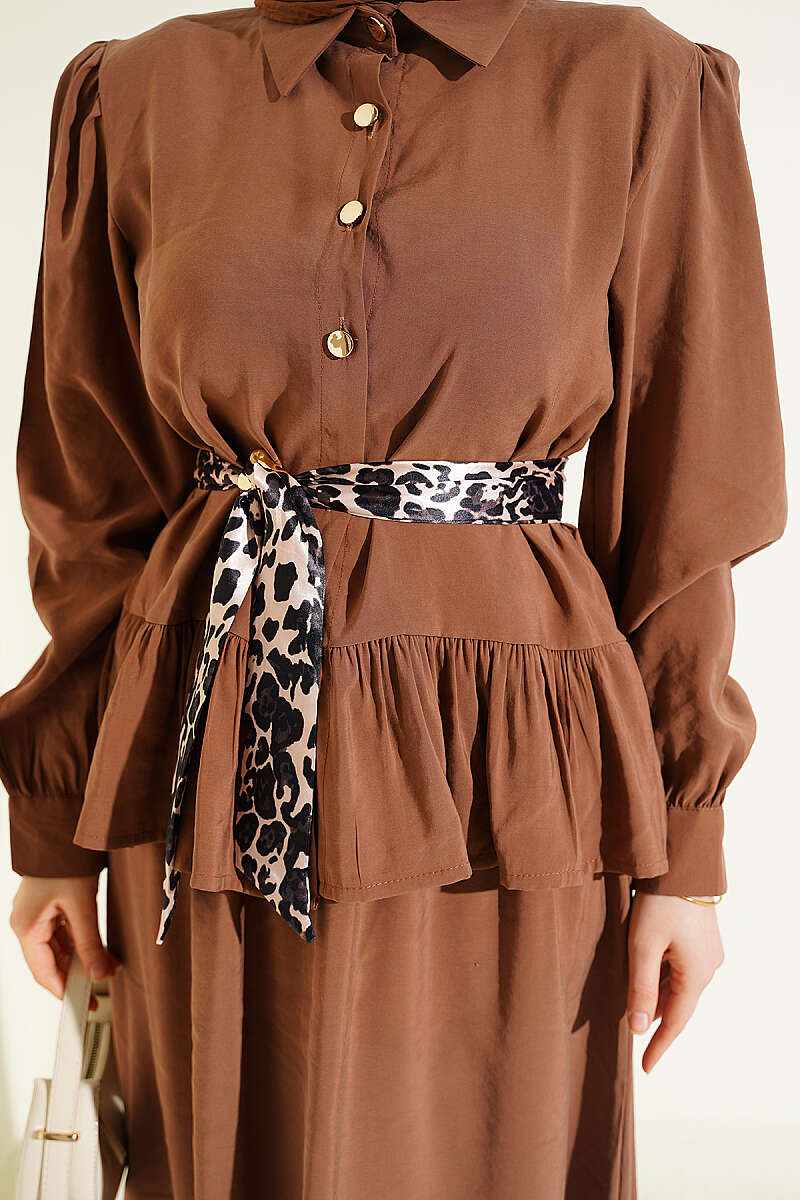 Leopar Fularlı Modal Etekli İkili Takım Latte