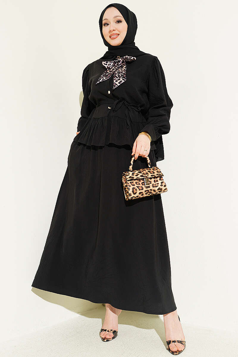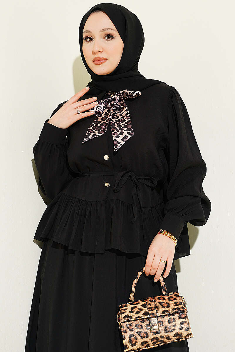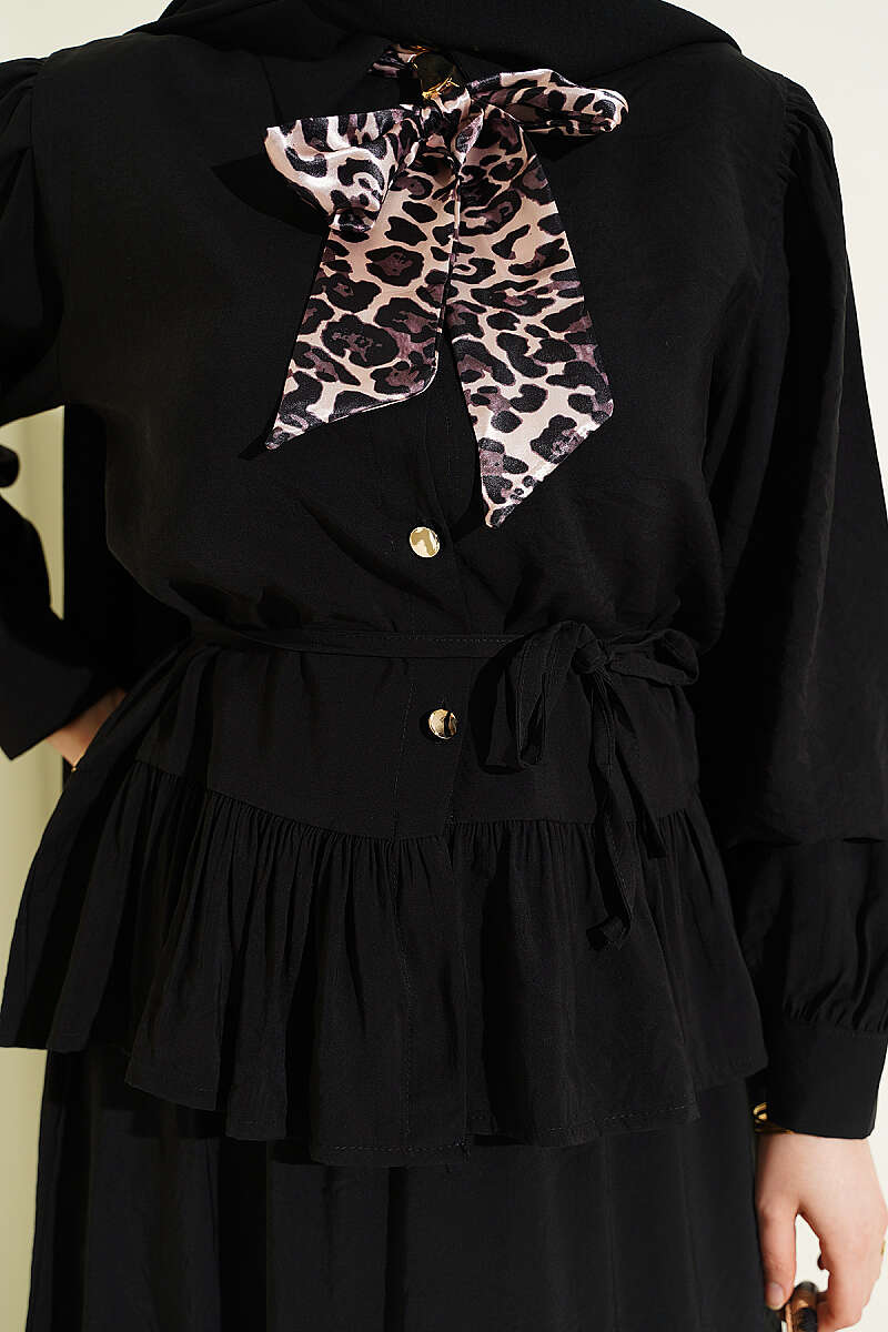 Leopar Fularlı Modal Etekli İkili Takım Siyah