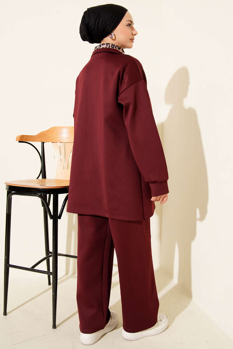 Kol Şeritli Düğmeli Scuba İkili Takım Bordo