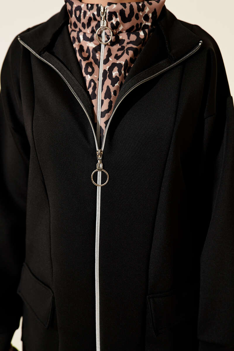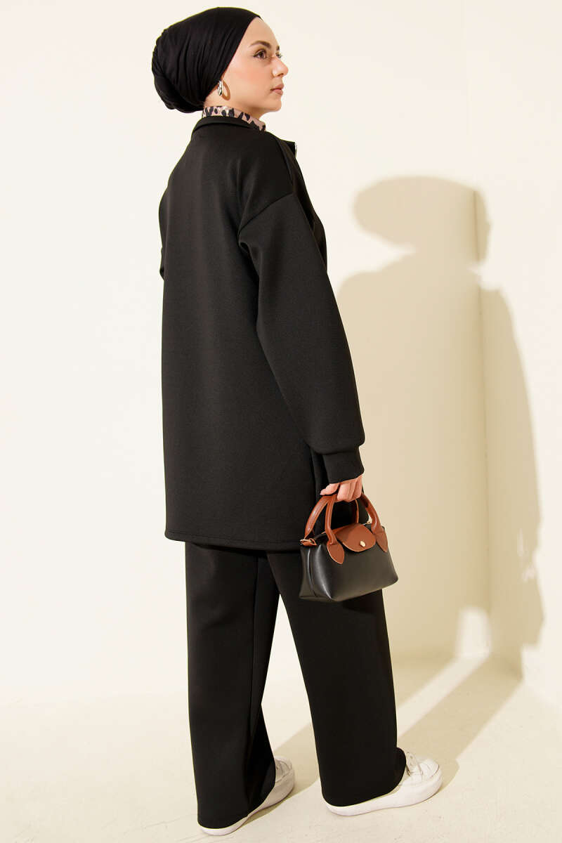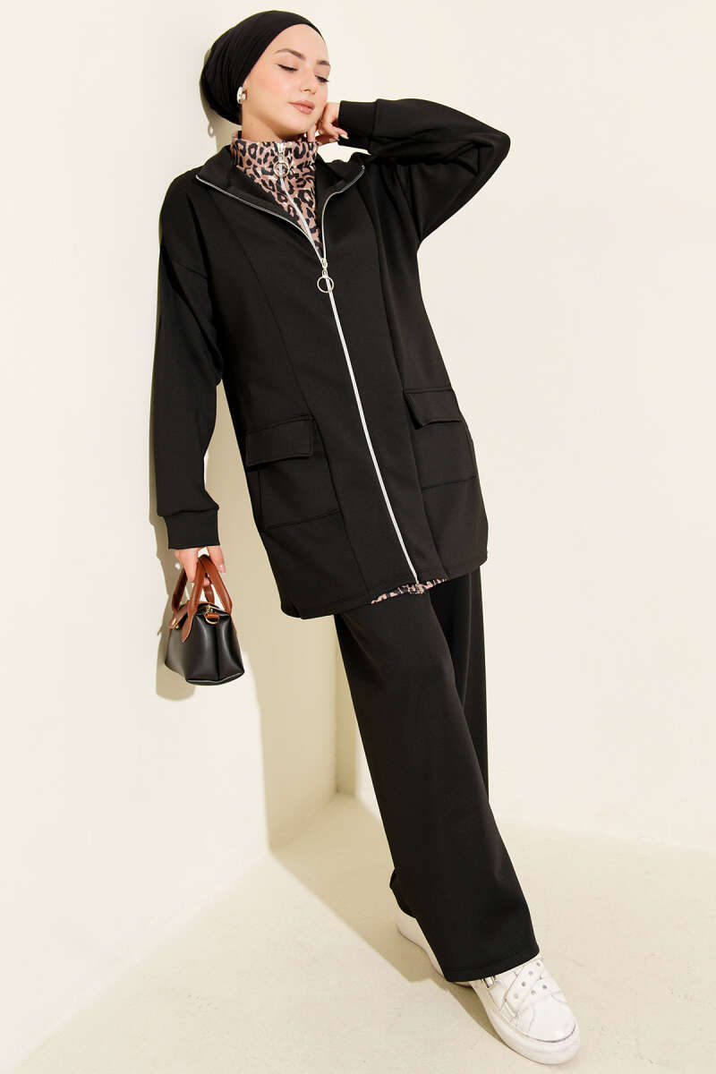 Leopar Garnili Fermuarlı Scuba İkili Takım Siyah Vizon
