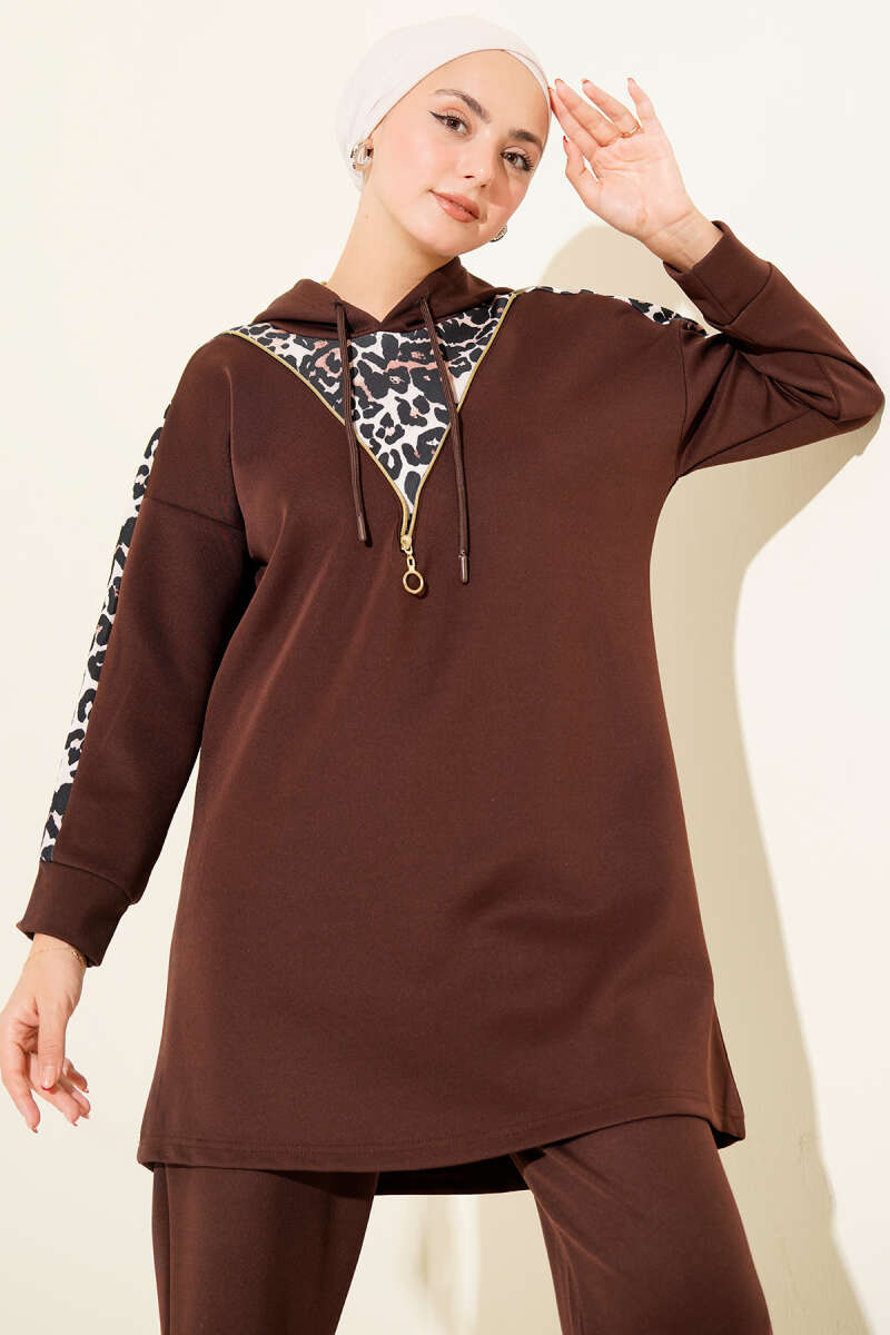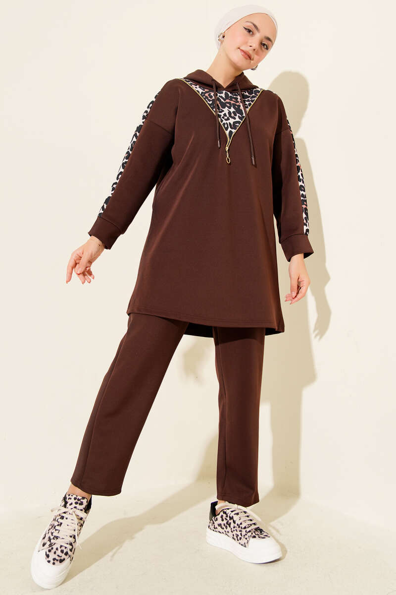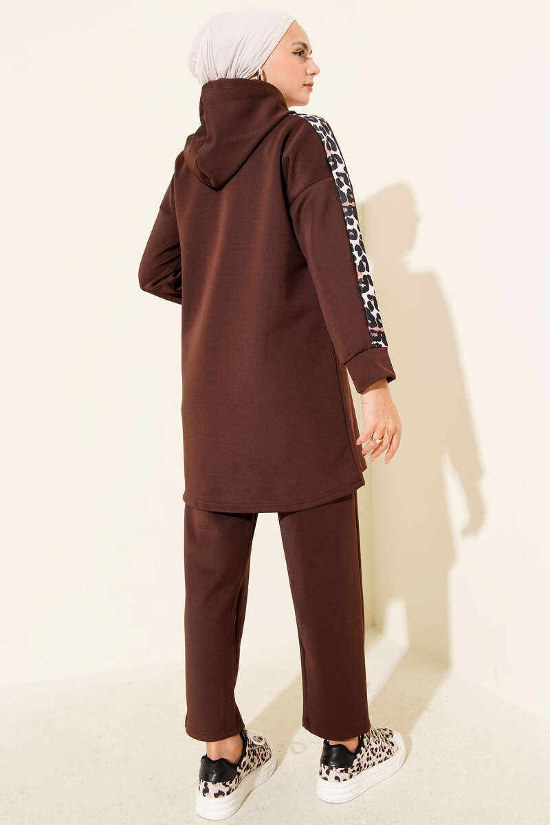 Leopar Garnili Kapşonlu İkili Takım Acı Kahve