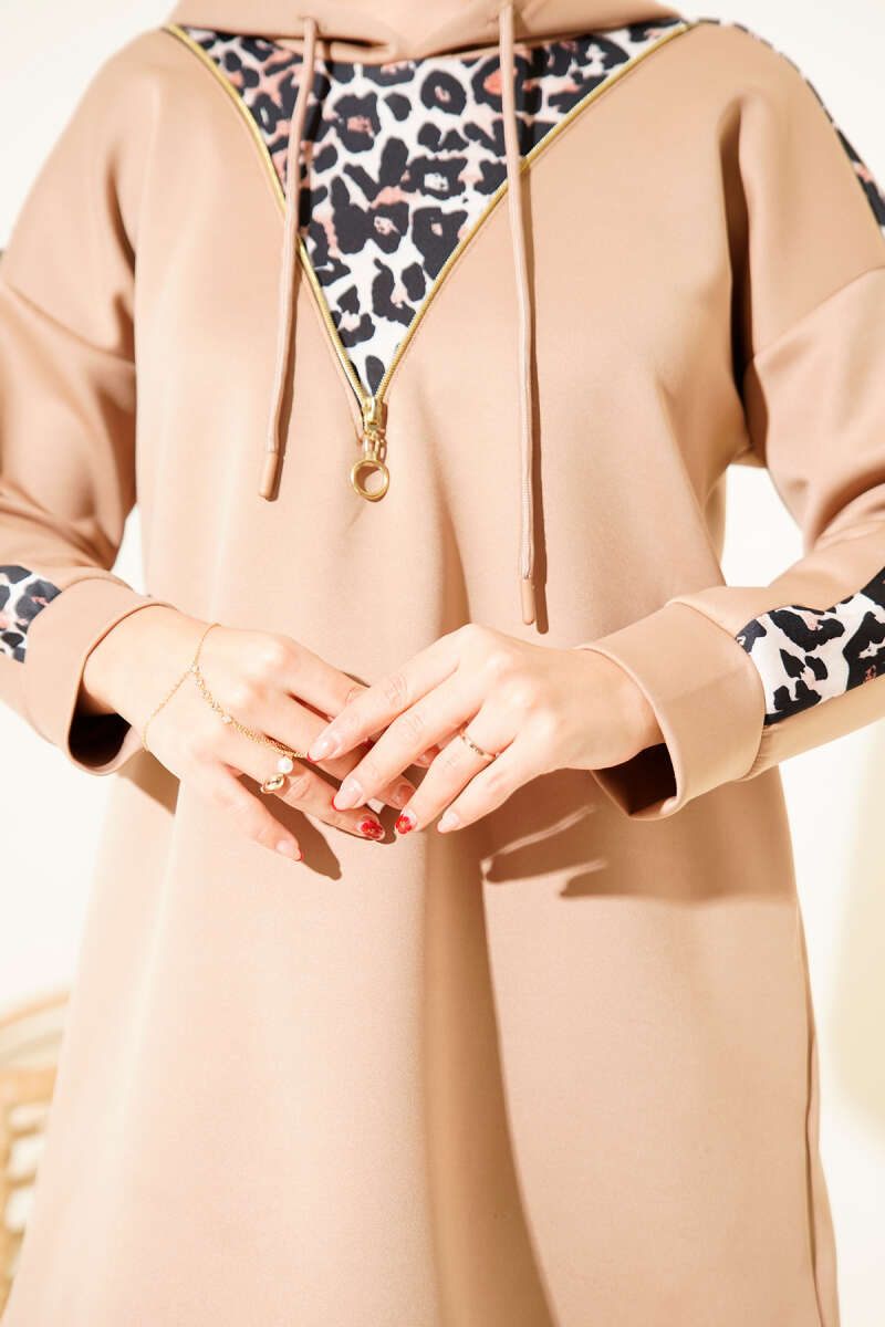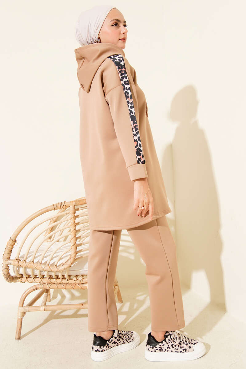 Leopar Garnili Kapşonlu İkili Takım Bej