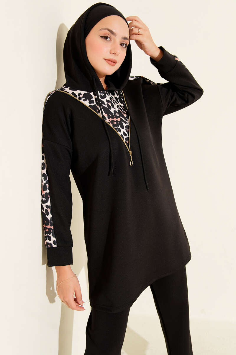 Leopar Garnili Kapşonlu İkili Takım Siyah