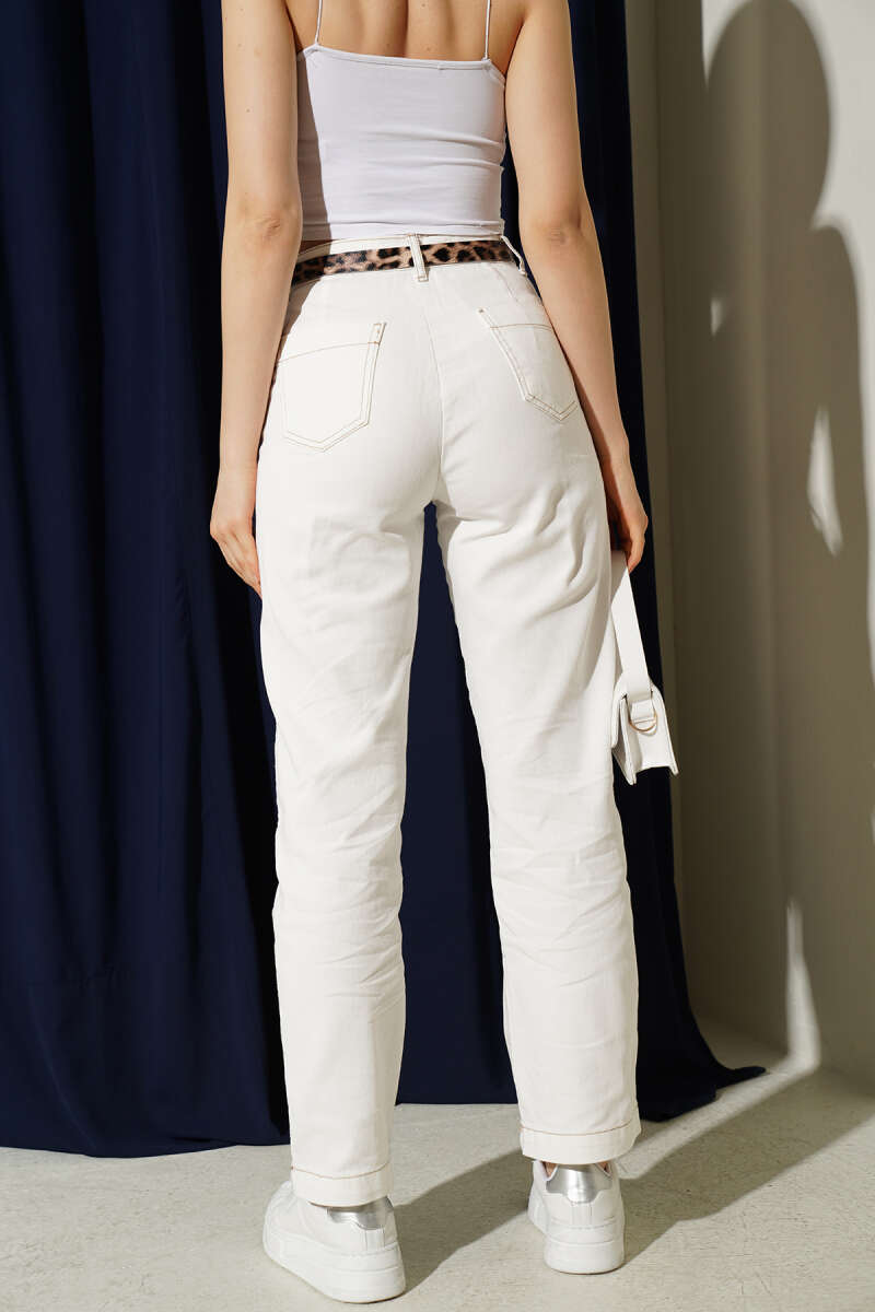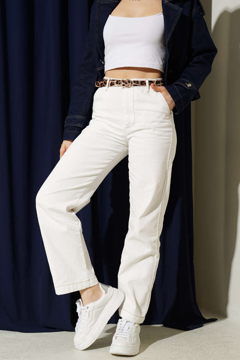 Leoparlı Kemerli Kot Pantolon Ekru