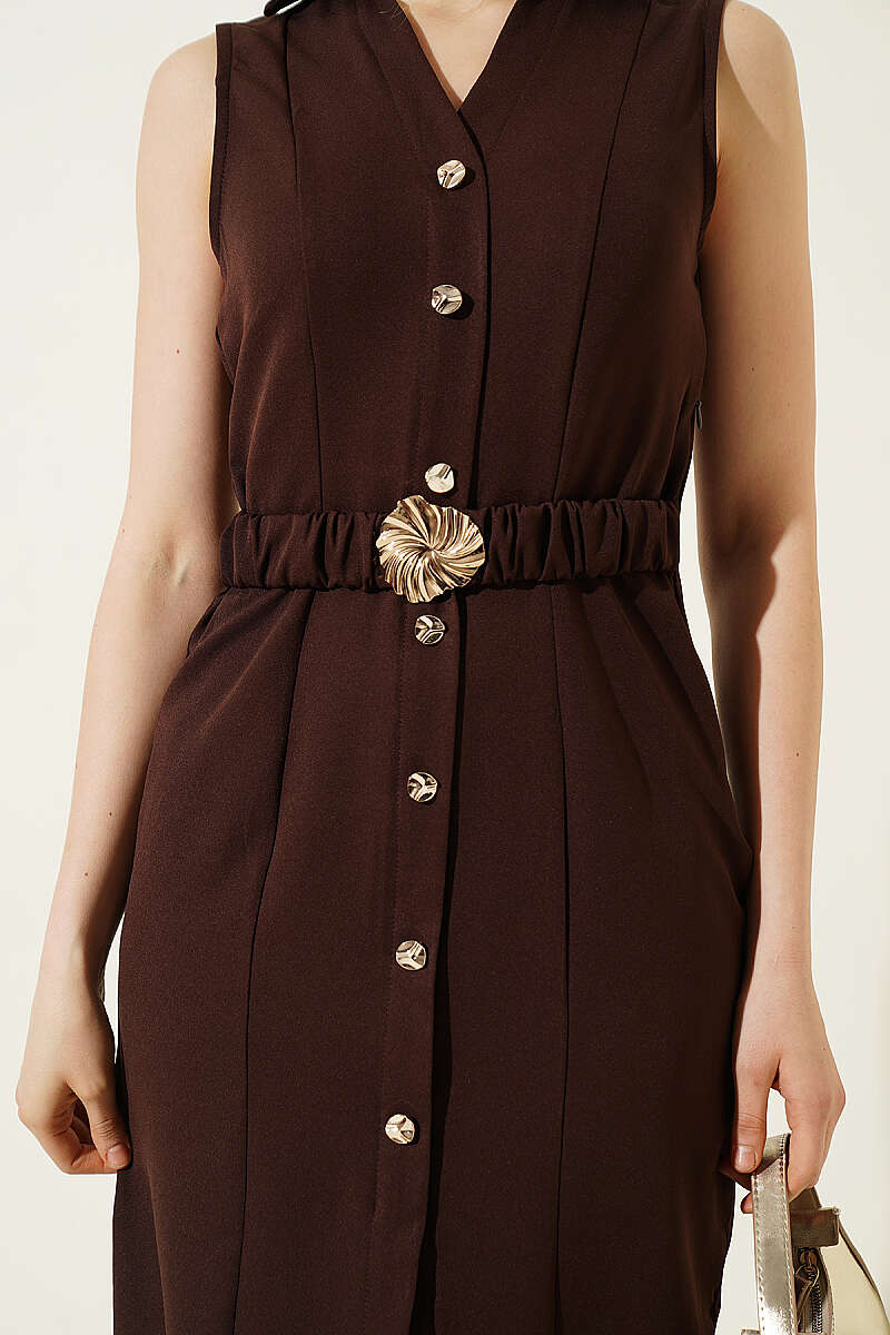 Düğme Görünümlü Kolsuz Midi Elbise Kahve