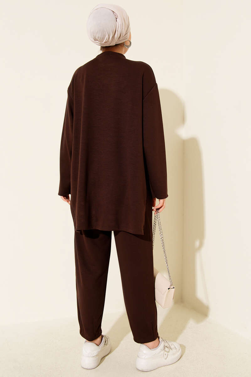 Brit Düğmeli Keten Tunik İkili Takım Vizon