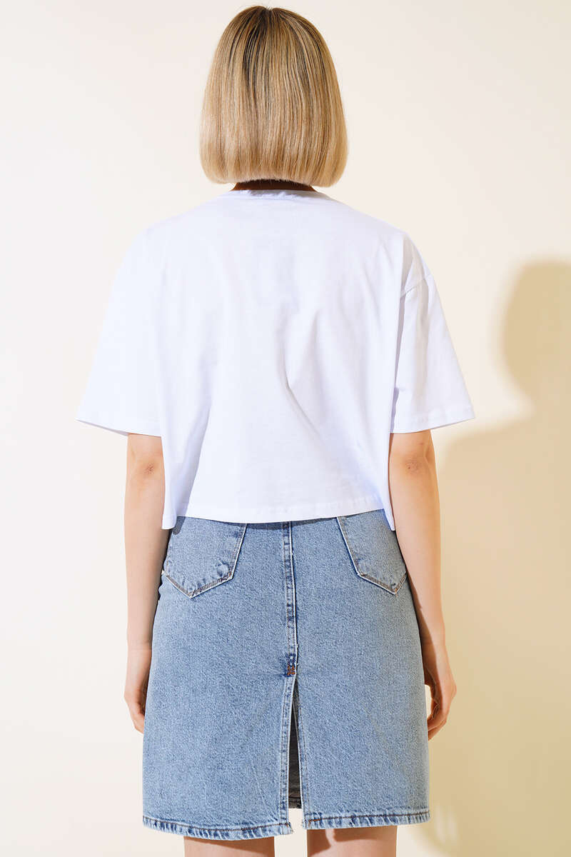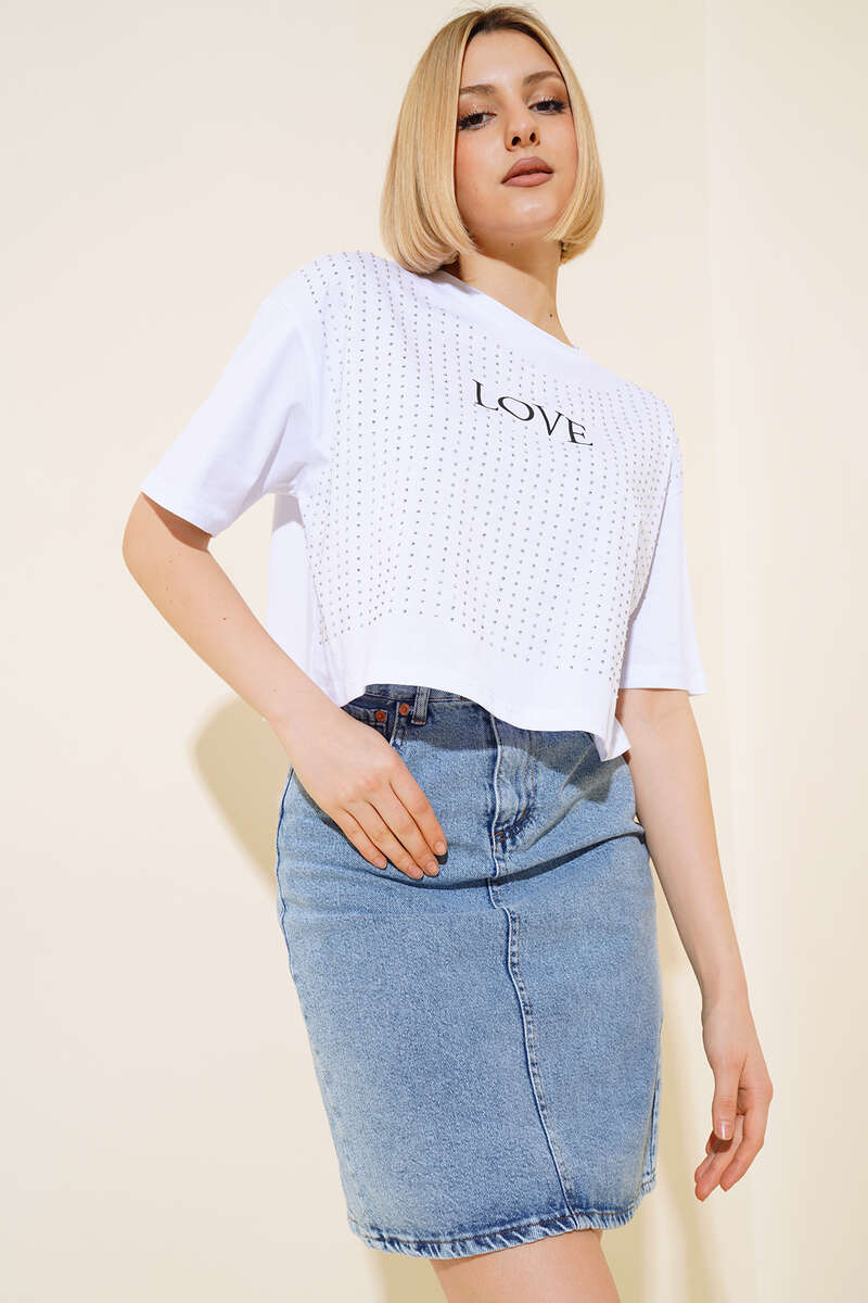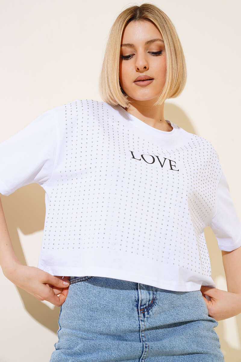 Yeni sezon tshirt modelimiz sizlerle beraber. T-shirtümüzün önü baskılı ve taşlıdır. Kısa koldur. T-shirtümüz oval yakadır. Kombinlerinizin vazgeçilmezi olacak.