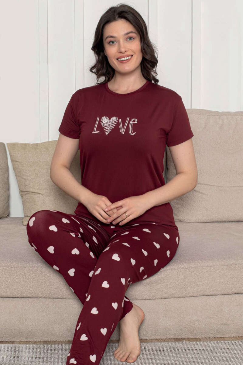 Love Yazılı Kalpli Pijama Takımı Bordo
