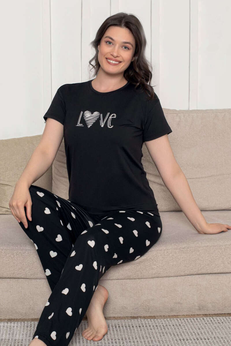 Love Yazılı Kalpli Pijama Takımı Siyah Beyaz