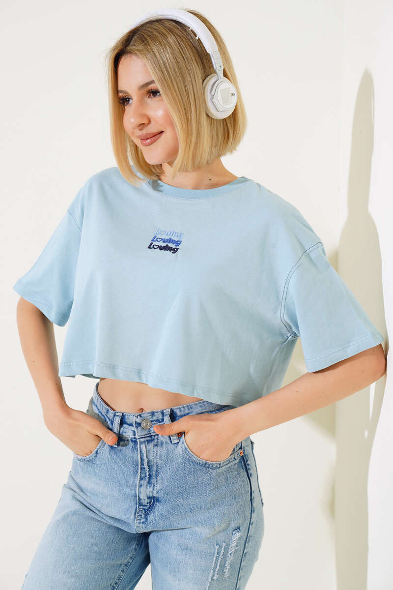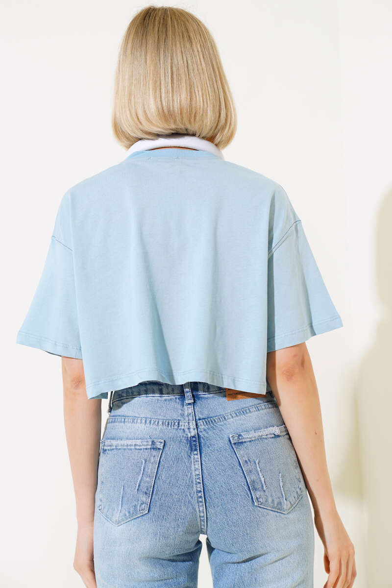 Bisiklet Yaka Bürümcük T-shirt Mavi