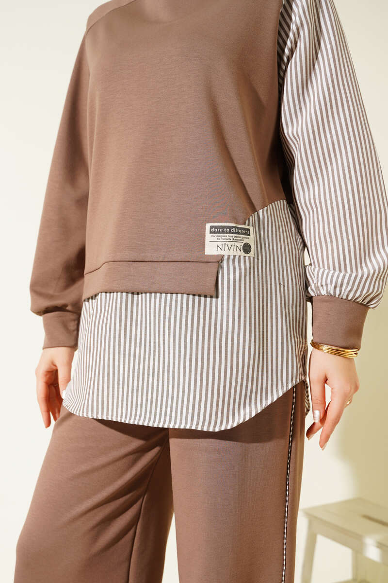 Loyşa Çizgi Garnili Tunik İkili Takım Vizon