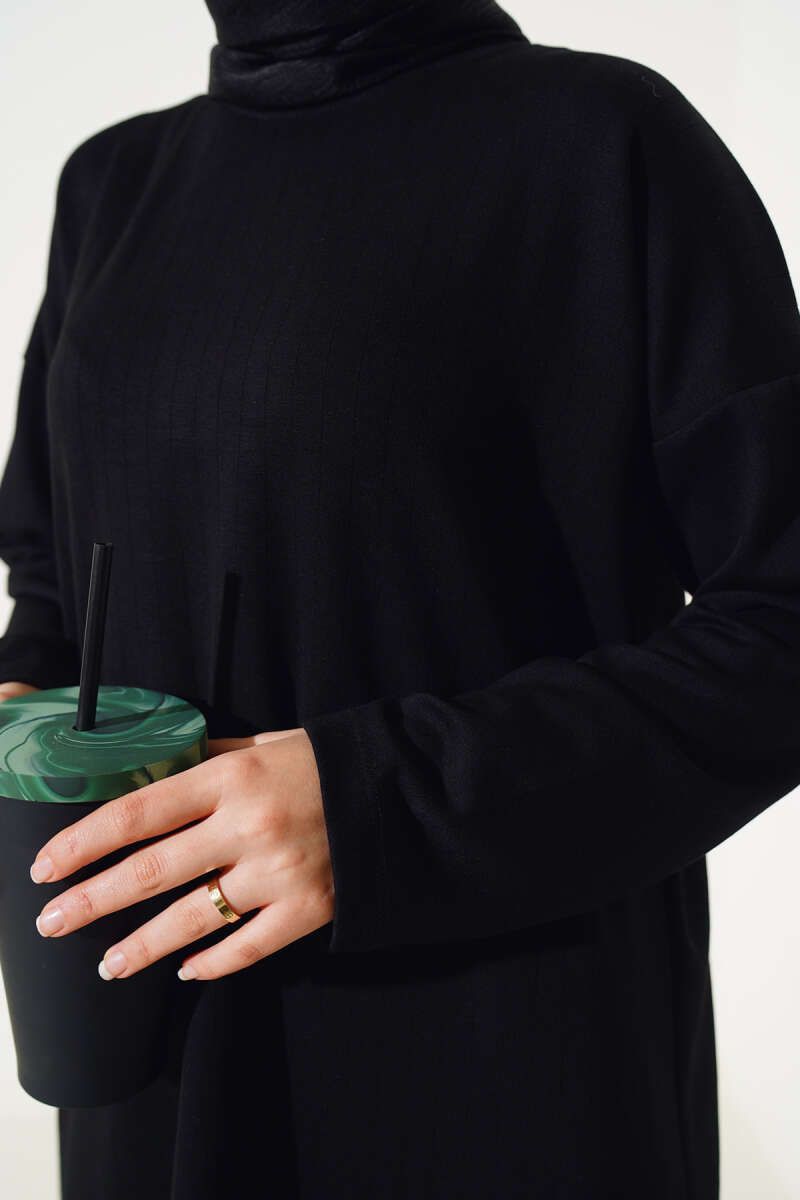 Kemerli Bürümcük Elbise İkili Takım Siyah