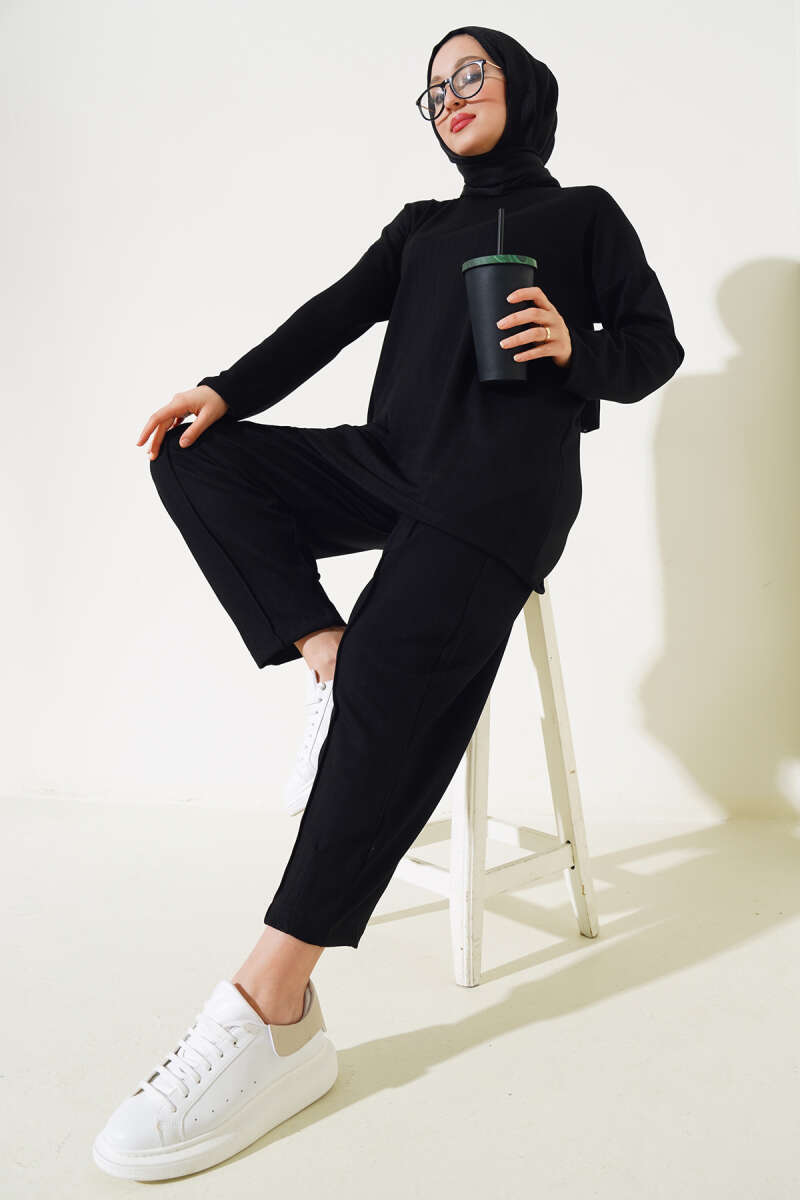 Kot Yakalı Fermuarlı Triko İkili Takım Siyah