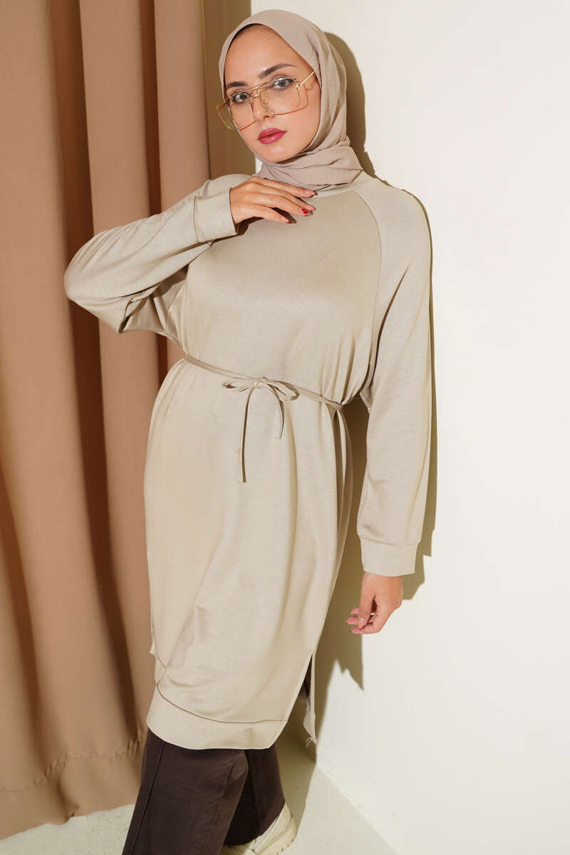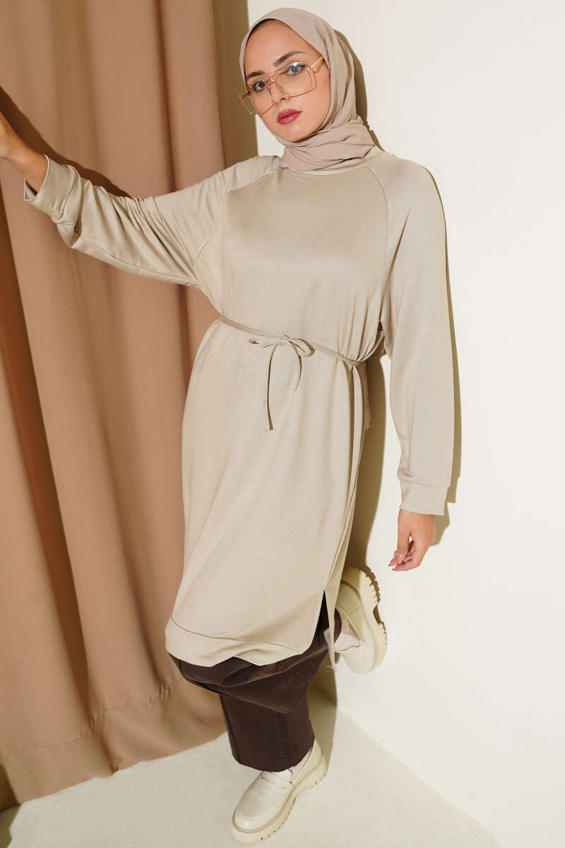 Gömlek Yaka Kuşaklı Kaşe Panço Bej