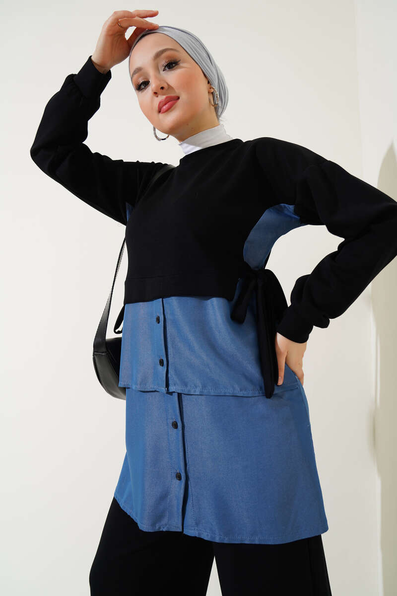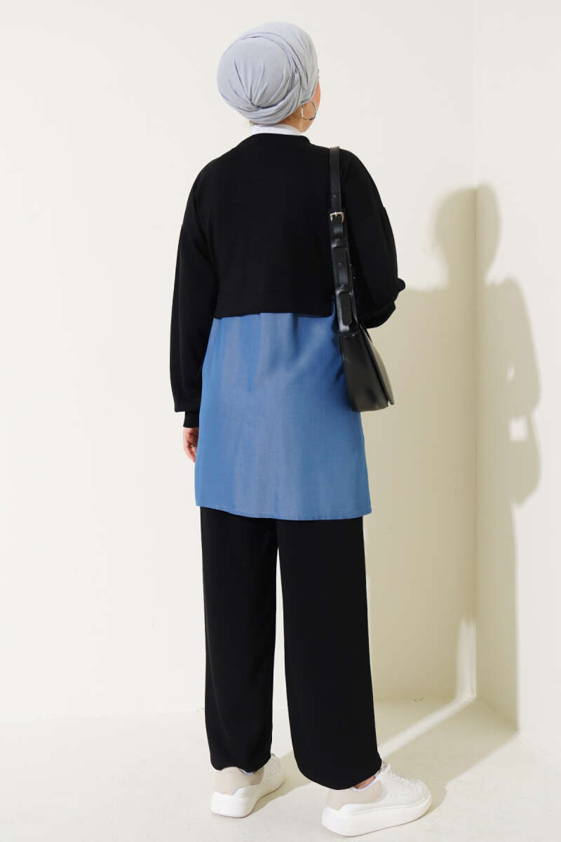 Fitilli Dik Yaka Uzun Tunik Triko İkili Takım Saks