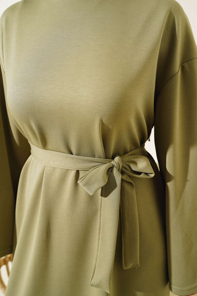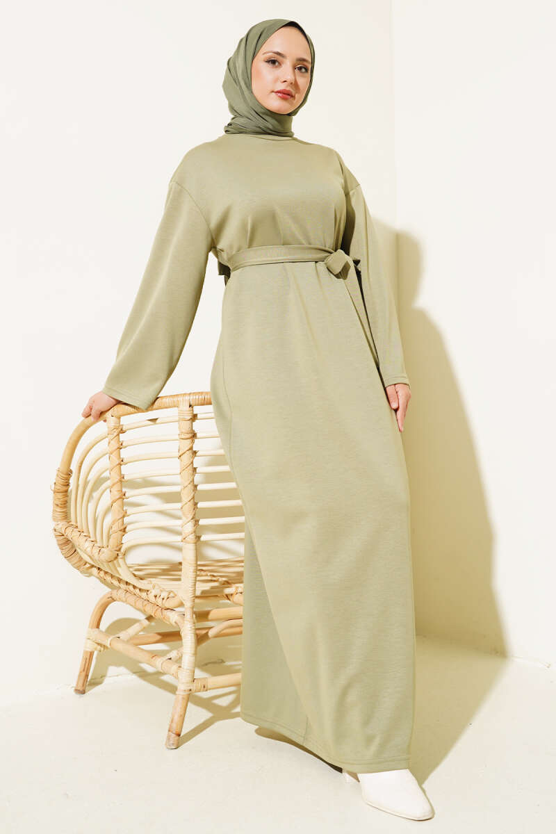Yakası Yarım Fermuarlı Triko Elbise Yağ Yeşili
