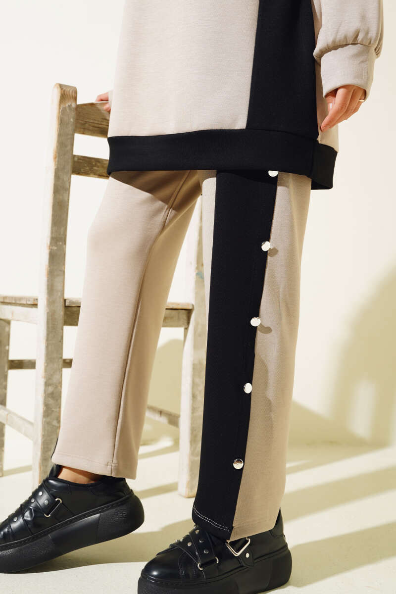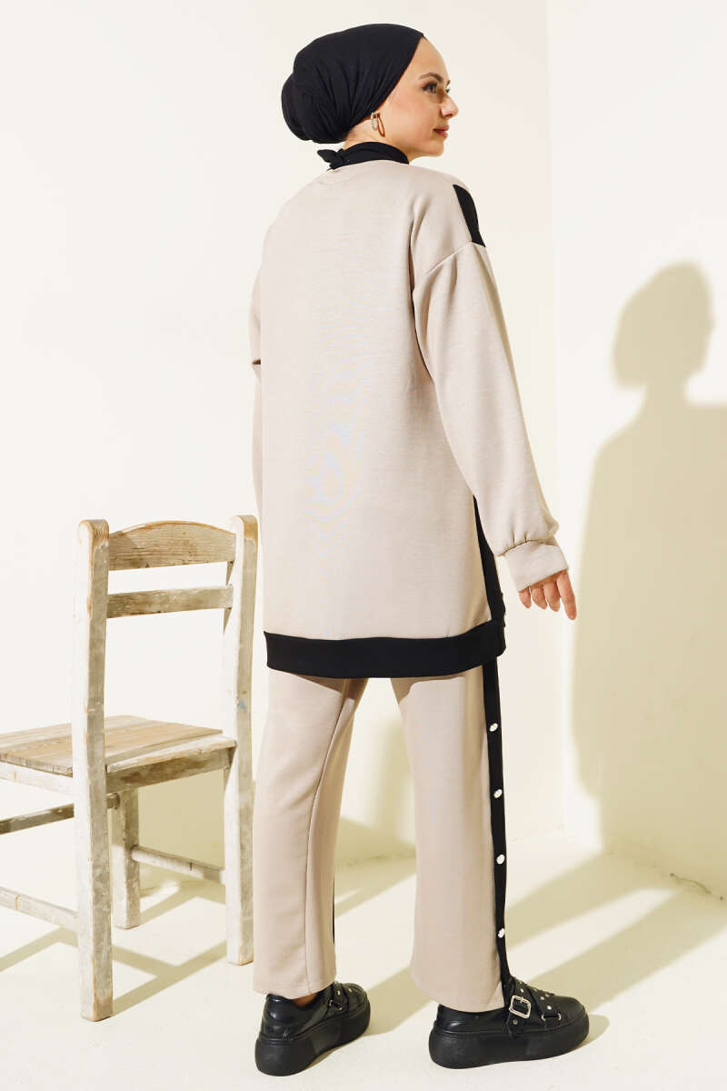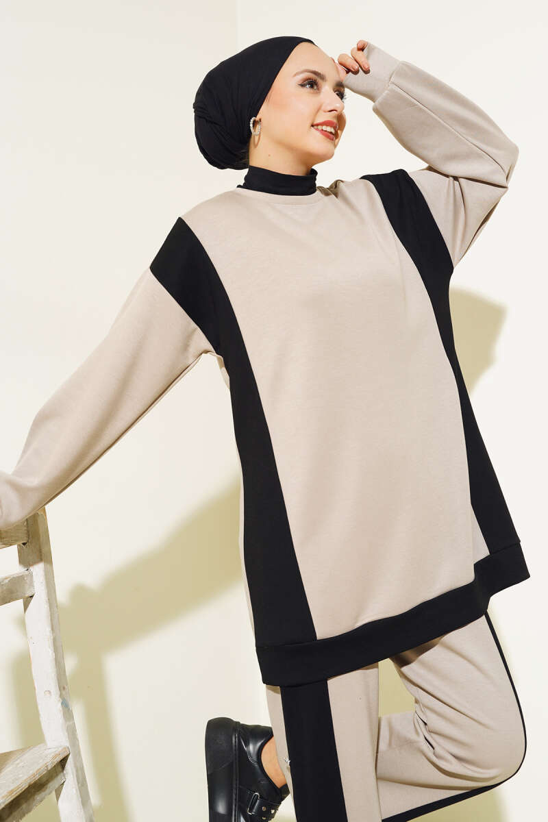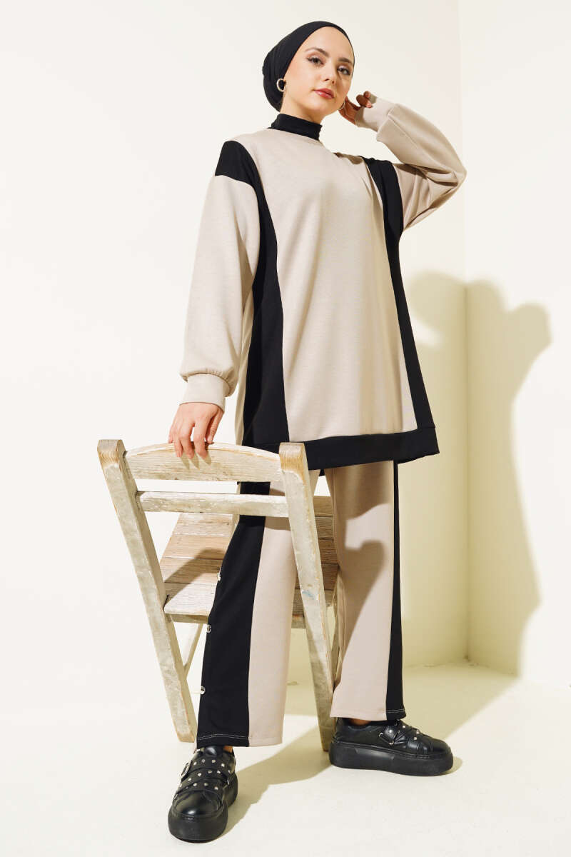 Gömlek Garnili Tünelli Çizgili Takım Bej