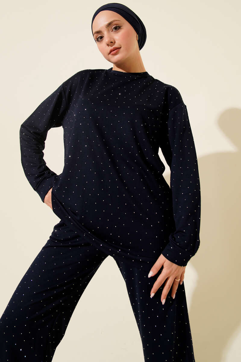 Omuz Boncuk Süslemeli İkili Takım Lacivert
