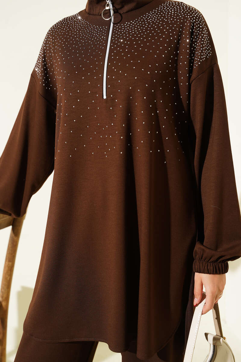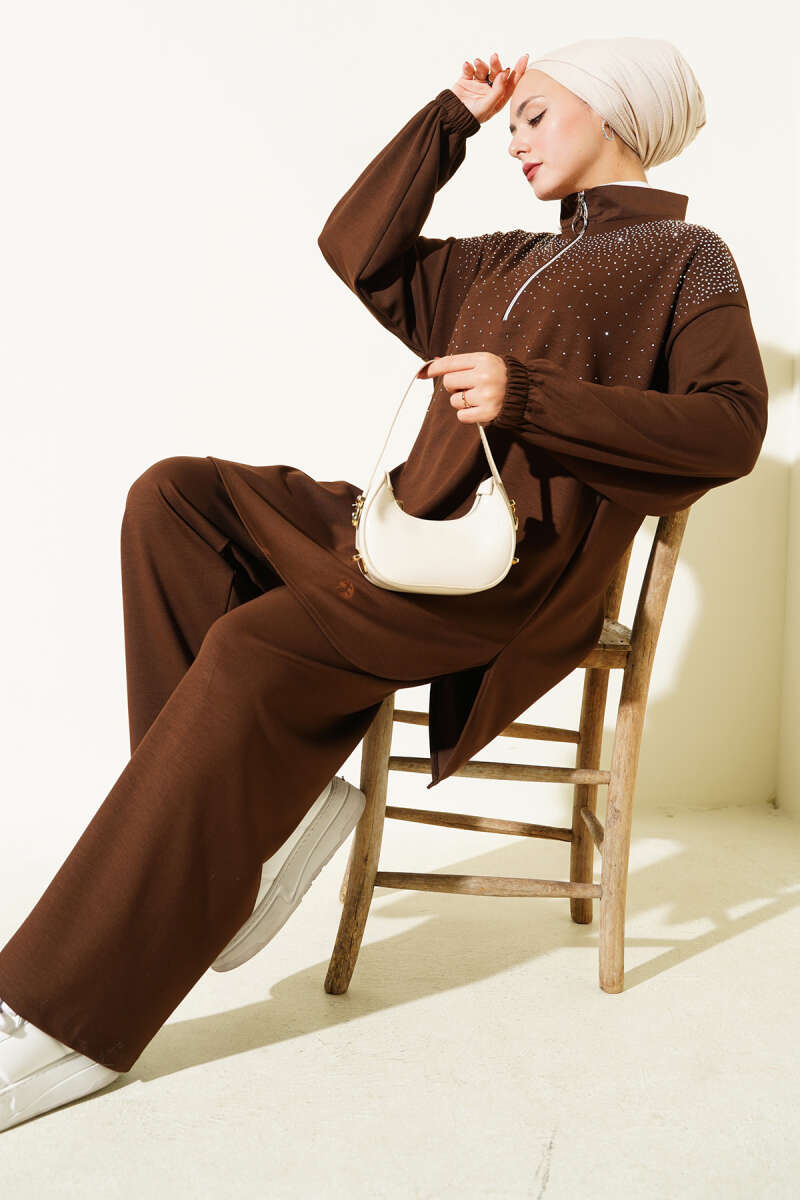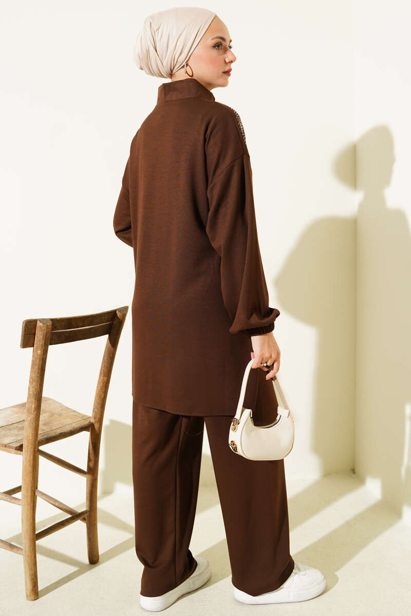 Loyşa Omuz Taşlı Fermuarlı İkili Takım Kahve