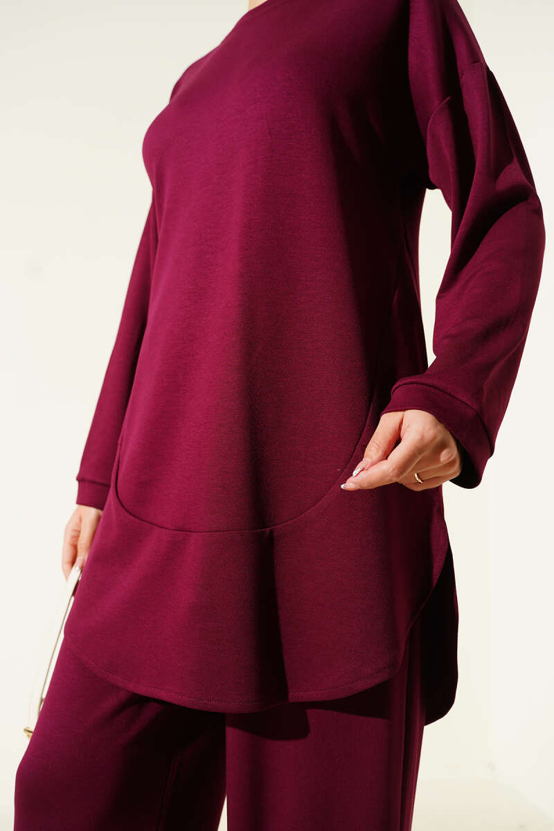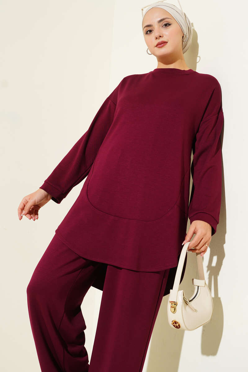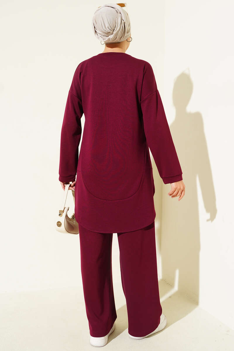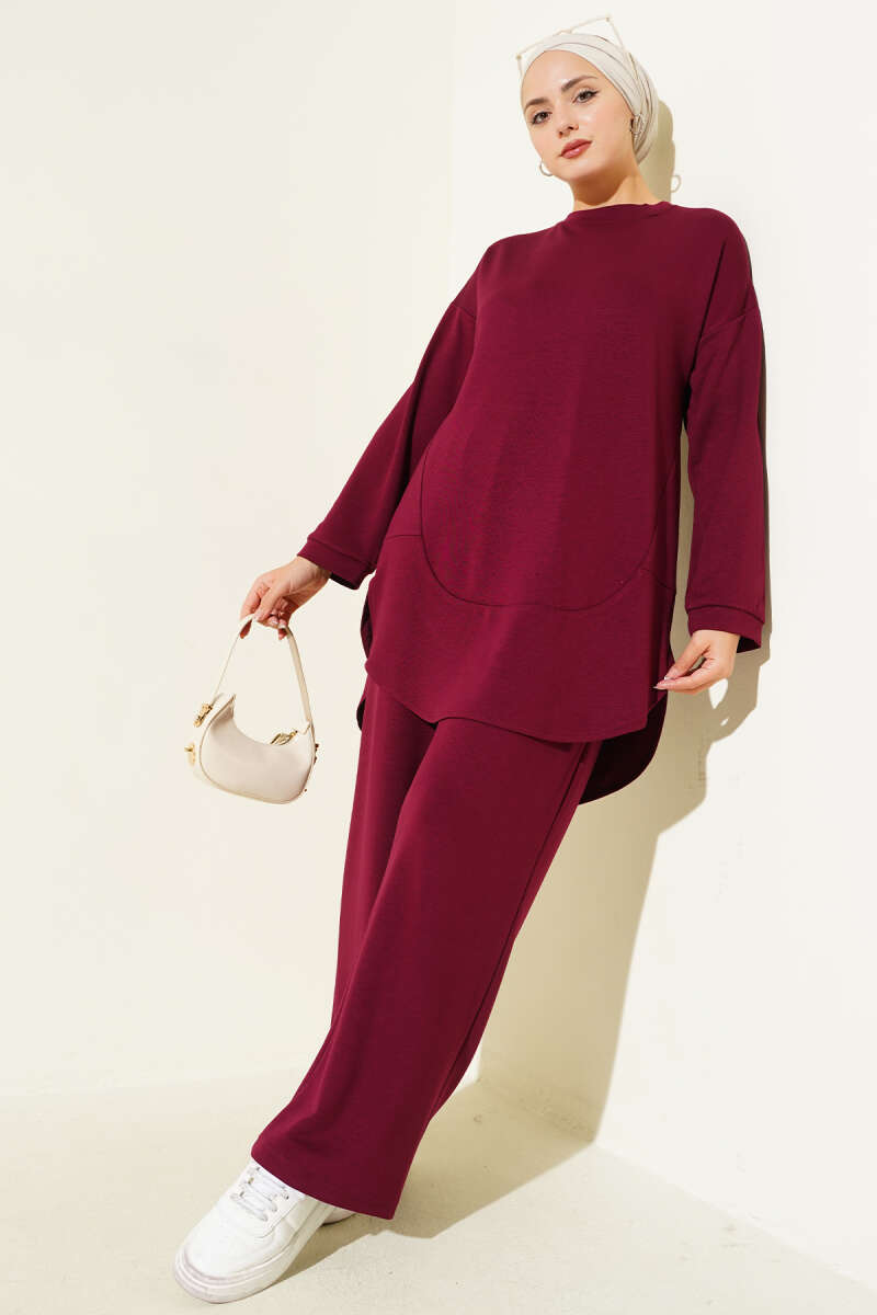 Kruvaze Yaka Ağaç Kabuğu Etekli Takım Bordo