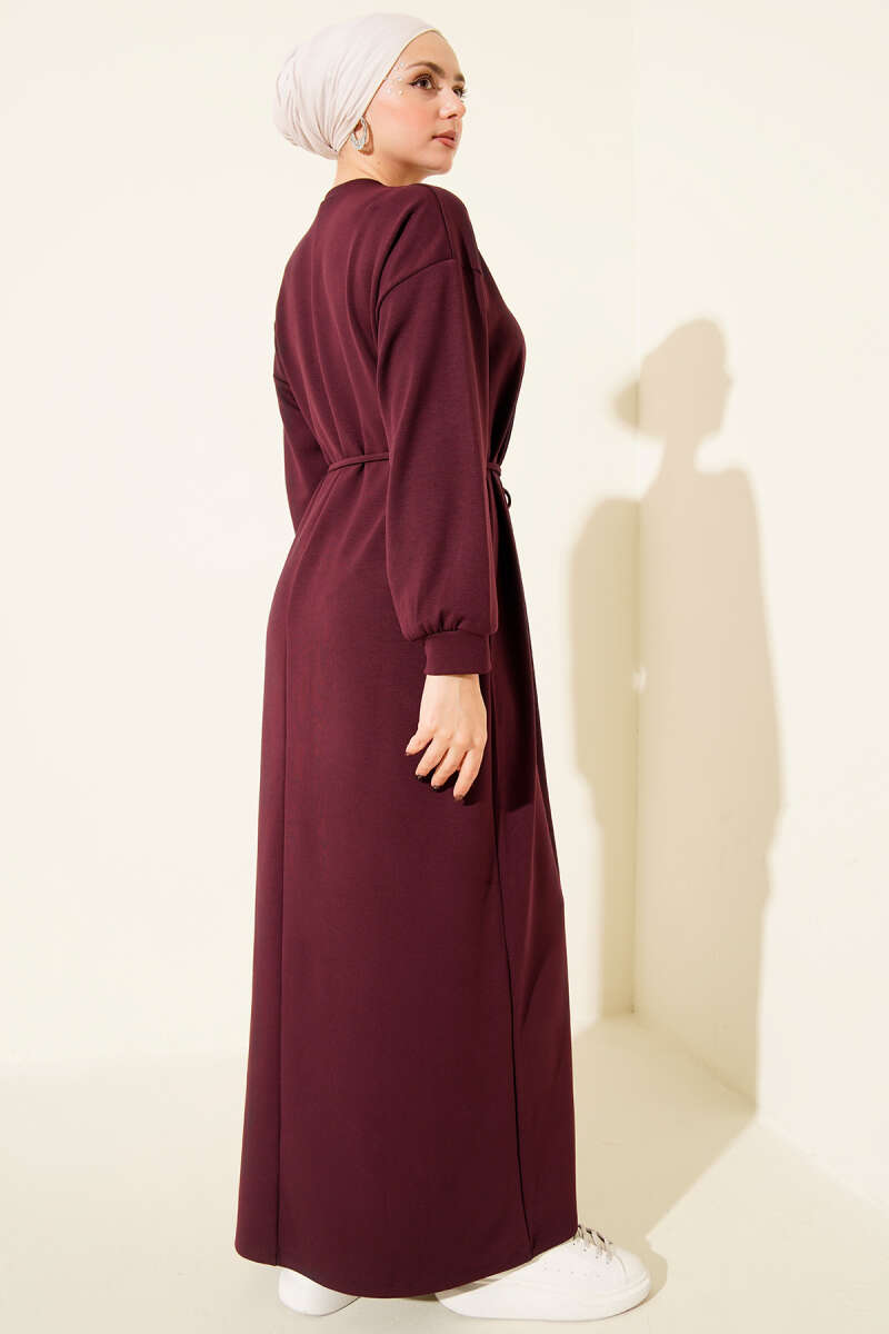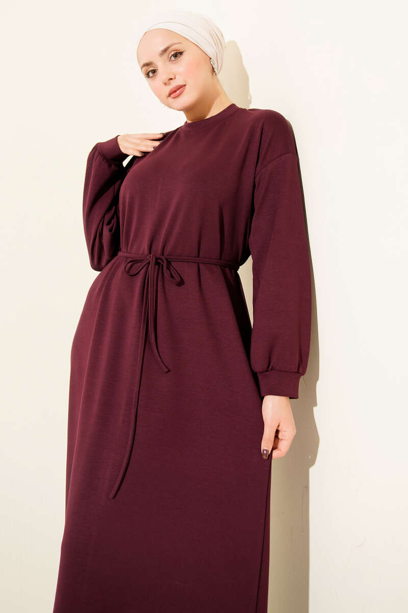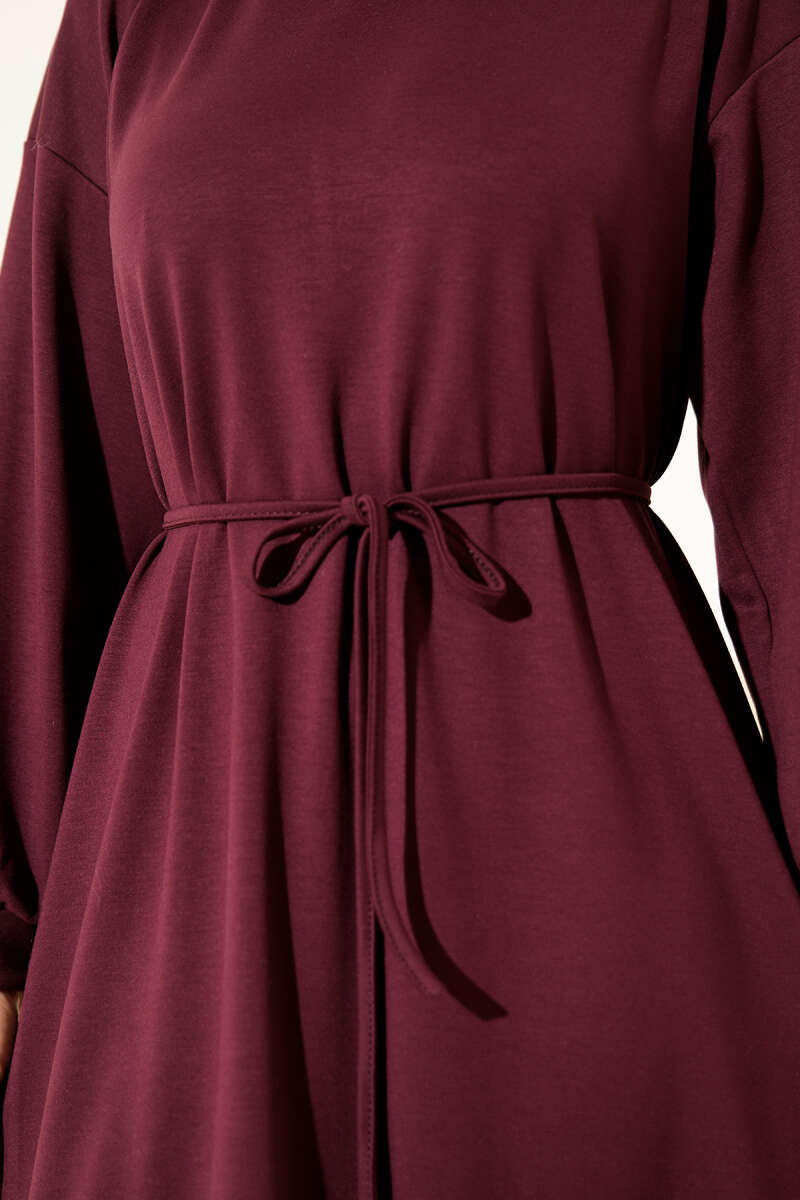 Bel Pensli Kuşaklı Dabıl Elbise Bordo