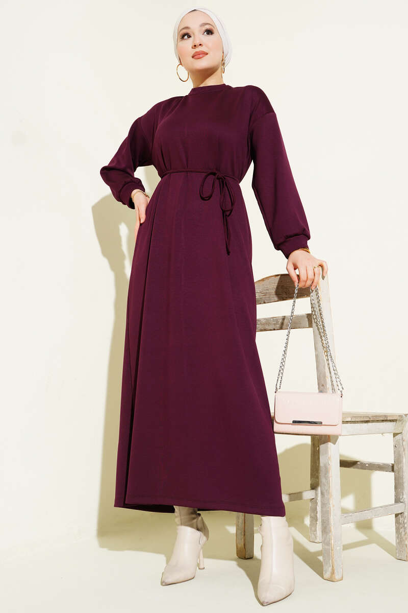 Kuşaklı Ekose Desenli Kloş Elbise Mürdüm