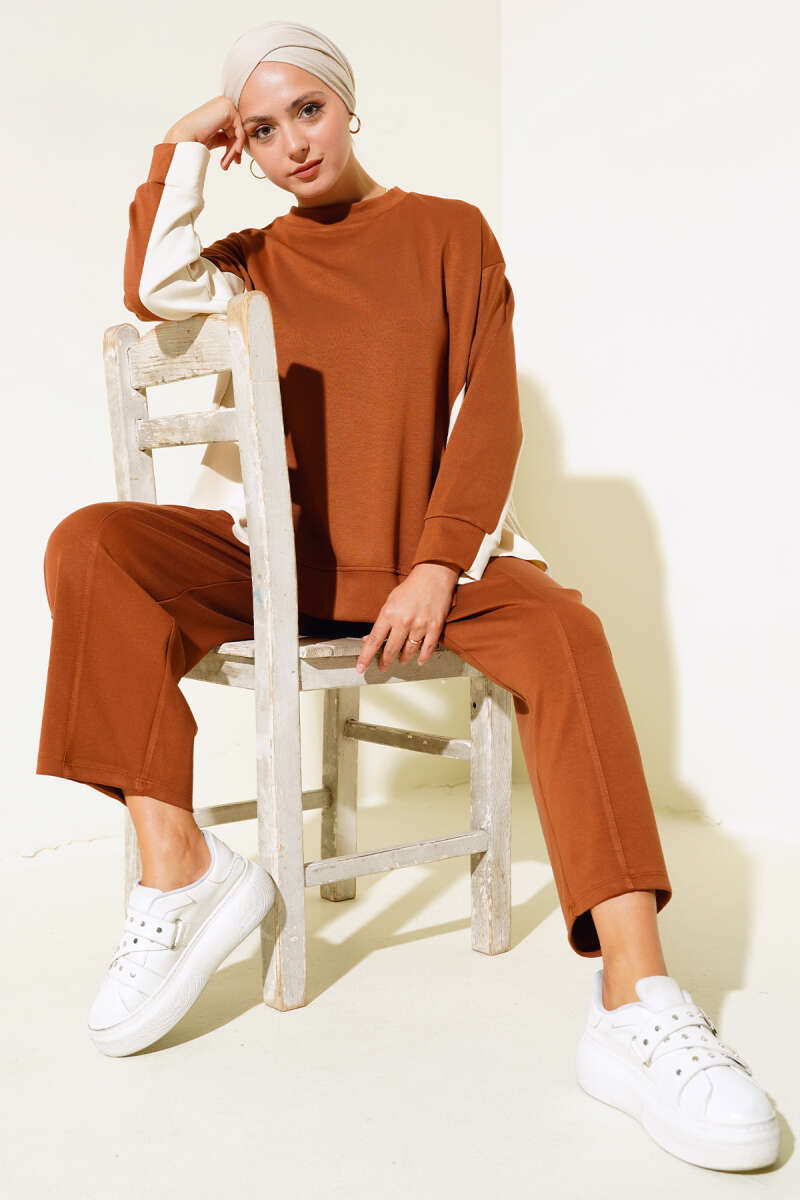 Önü Bağcık Detaylı Etekli İkili Takım Kahve