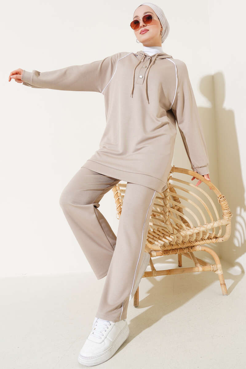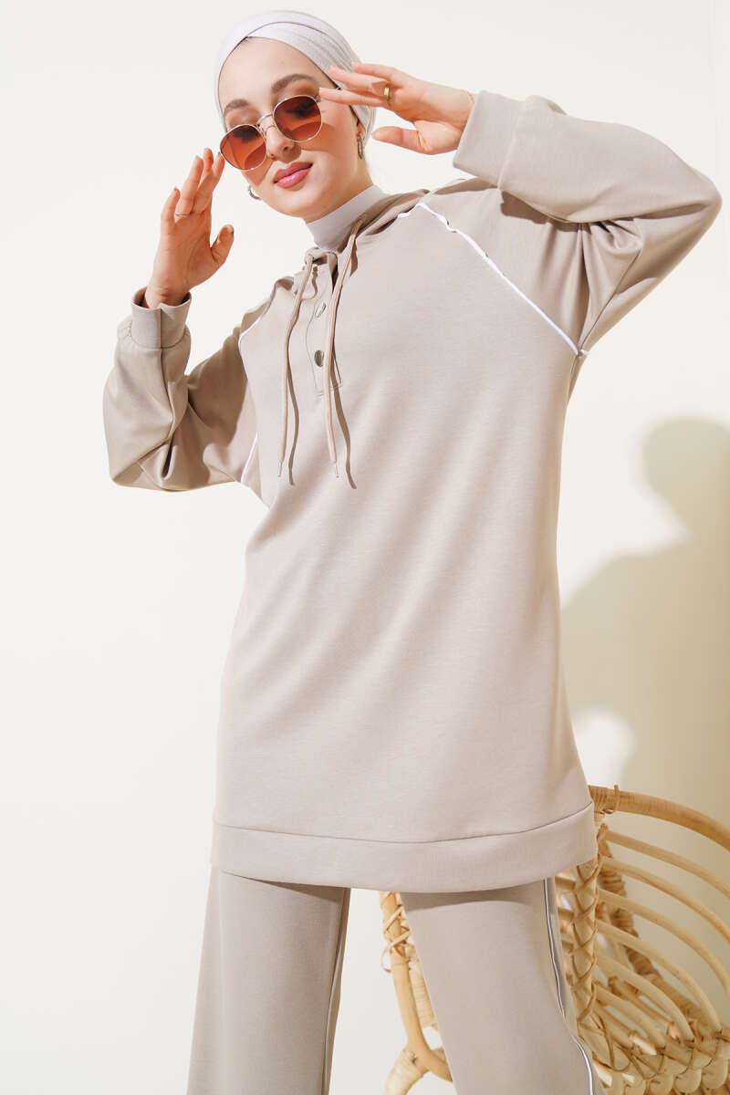 Yaka Çıtçıtlı Kapüşonlu İkili Takım Kahve