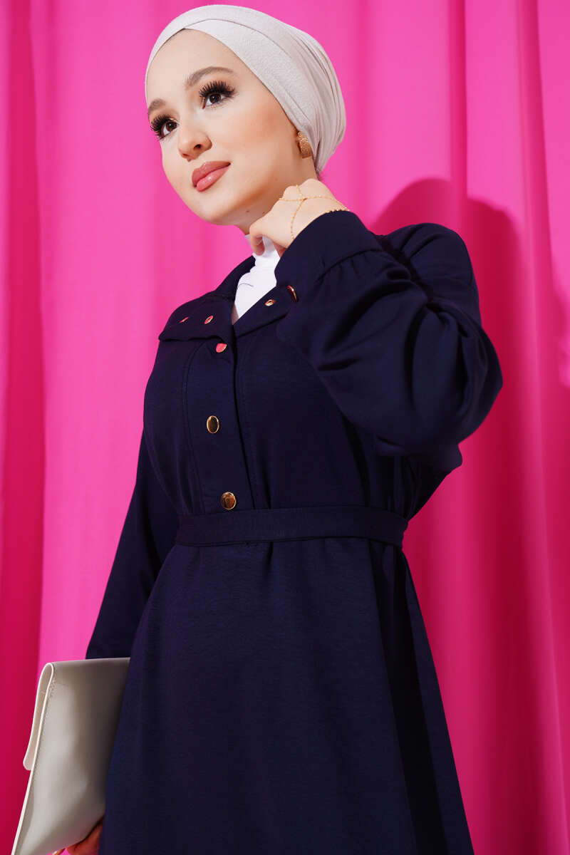 Metal Düğme Süslemeli Bağcıklı Elbise Siyah