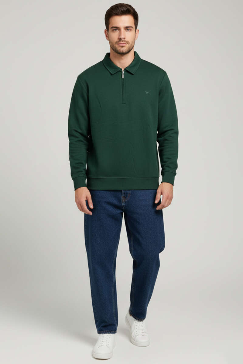 Gömlek Yaka Üç İplik Erkek Sweatshirt Zümrüt