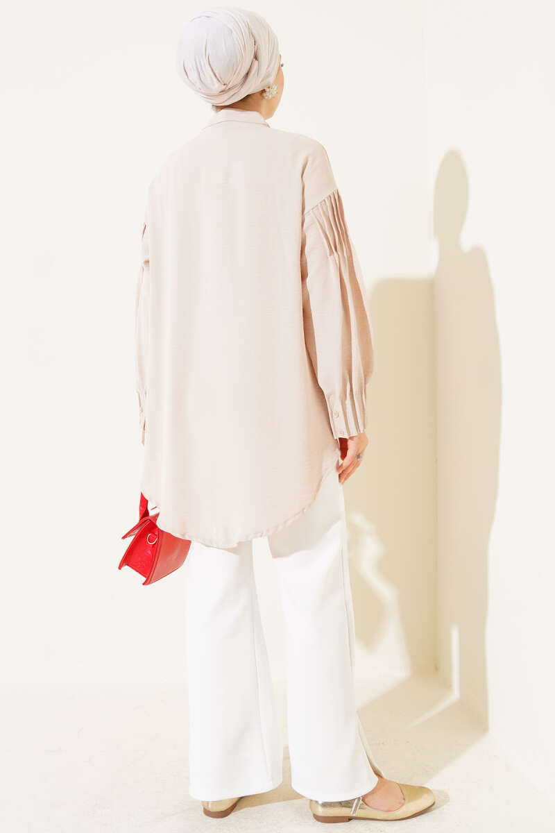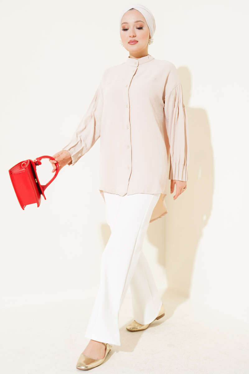 Yeni sezon tunik modelimiz sizlerle beraber. Tuniğimiz hakim yakadır. Boydan düğmelidir.  Kollarında büzgü detayları vardır. Kol bilekleri büzgülüdür ve iki adet düğme bulunur. Önü kısa arkası uzundur. Salaş bir yapıya sahiptir. Renk seçeneklerimiz mevcuttur.