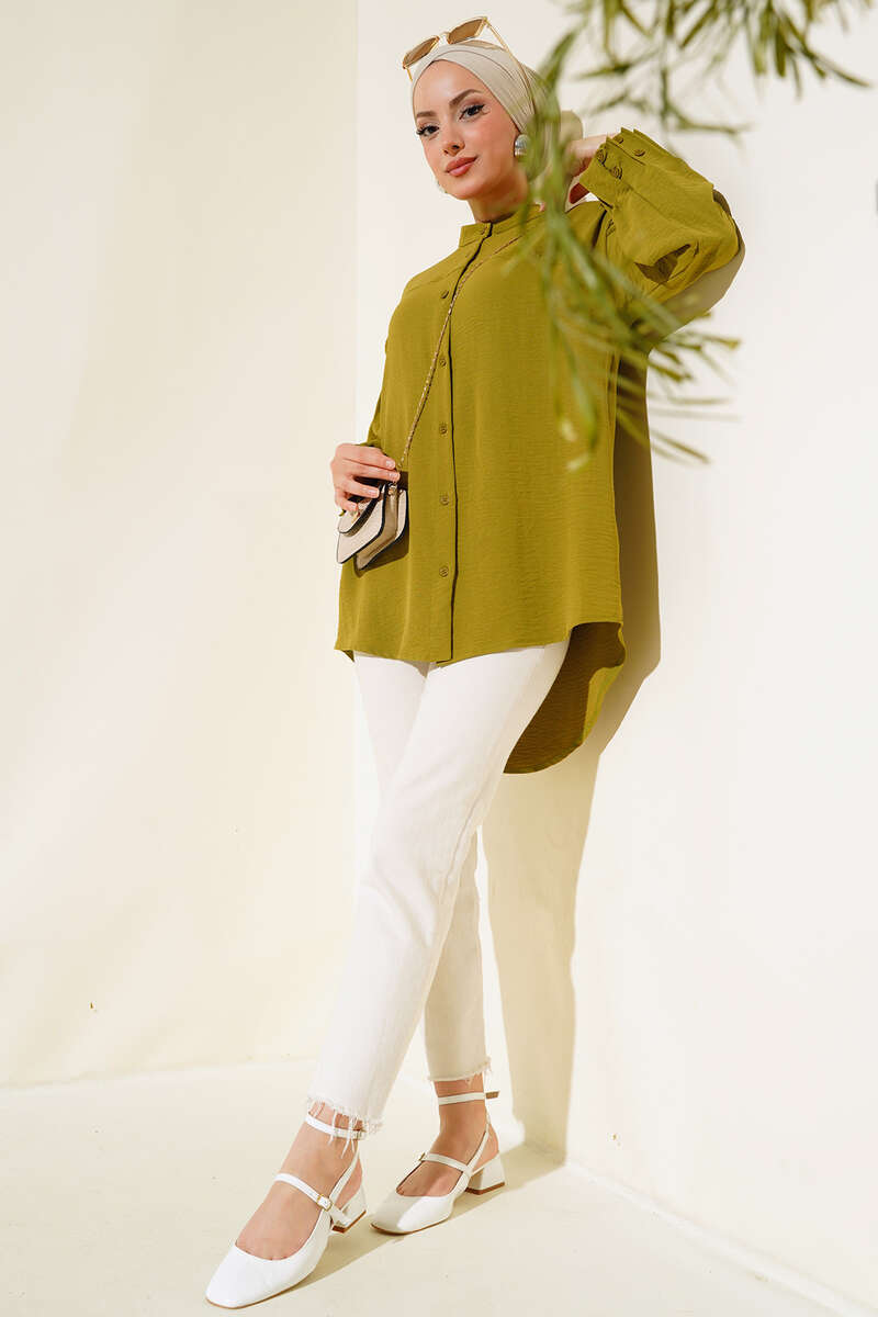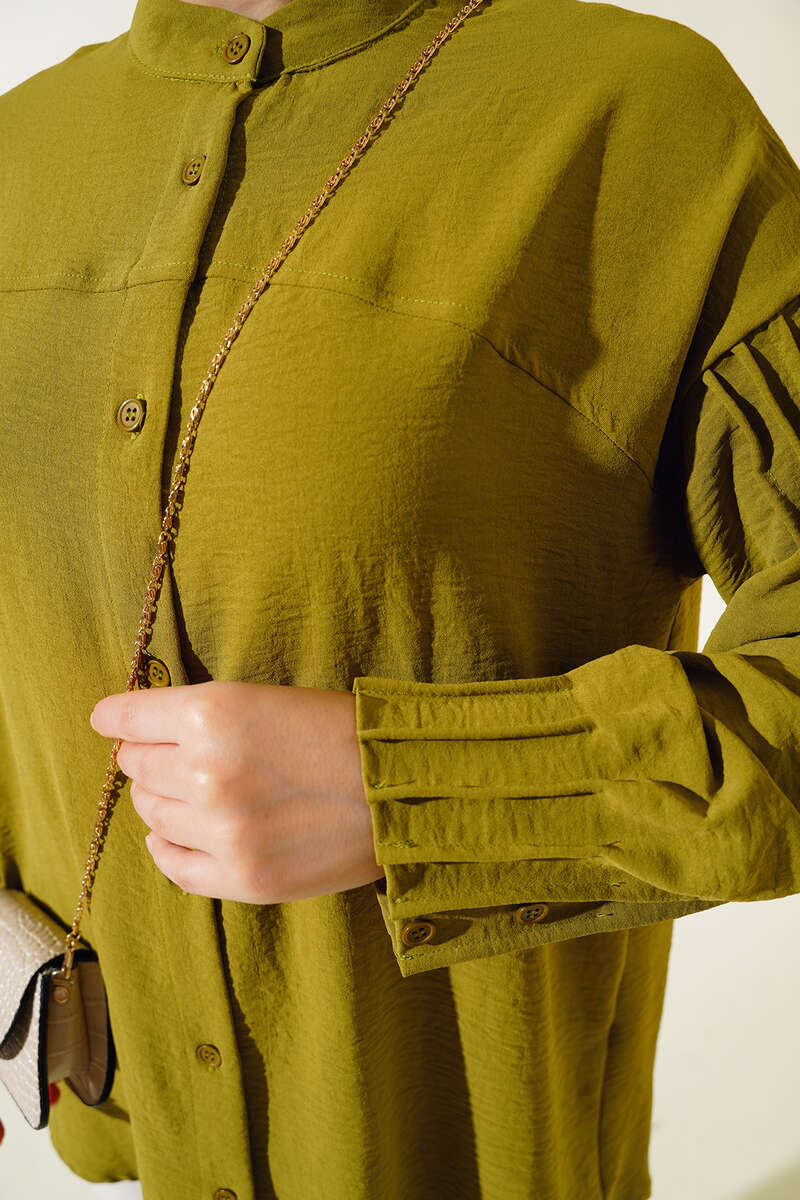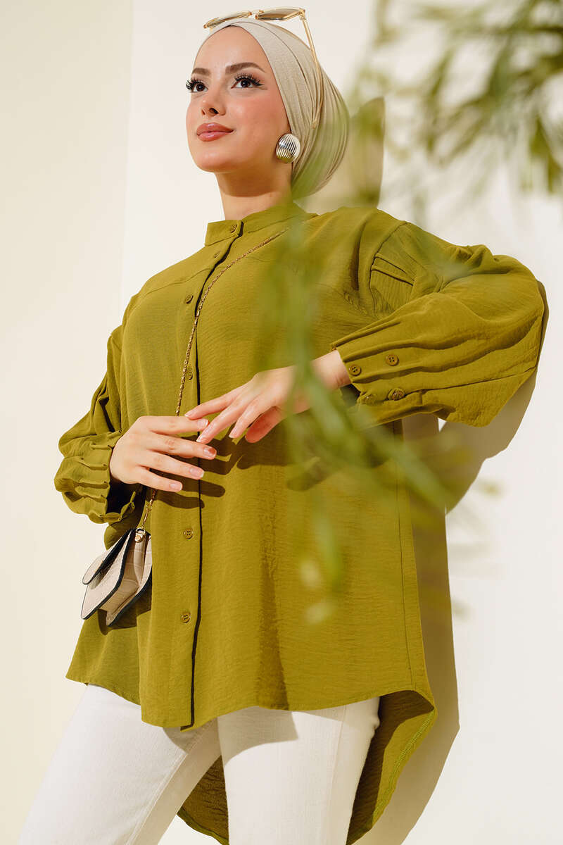 Yeni sezon tunik modelimiz sizlerle beraber. Tuniğimiz hakim yakadır. Boydan düğmelidir.  Kollarında büzgü detayları vardır. Kol bilekleri büzgülüdür ve iki adet düğme bulunur. Önü kısa arkası uzundur. Salaş bir yapıya sahiptir. Renk seçeneklerimiz mevcuttur.