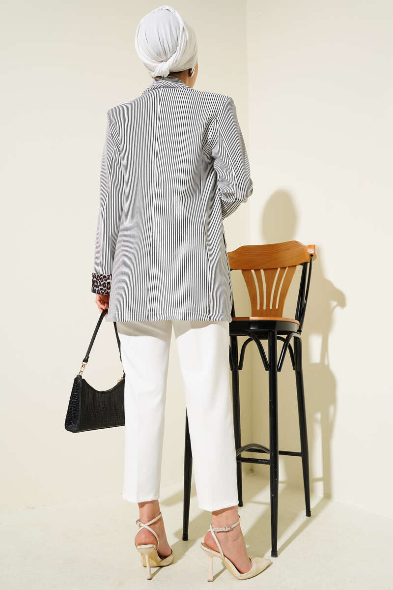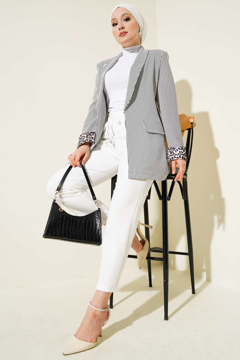 Manşet Detaylı Çizgili Blazer Ceket Beyaz