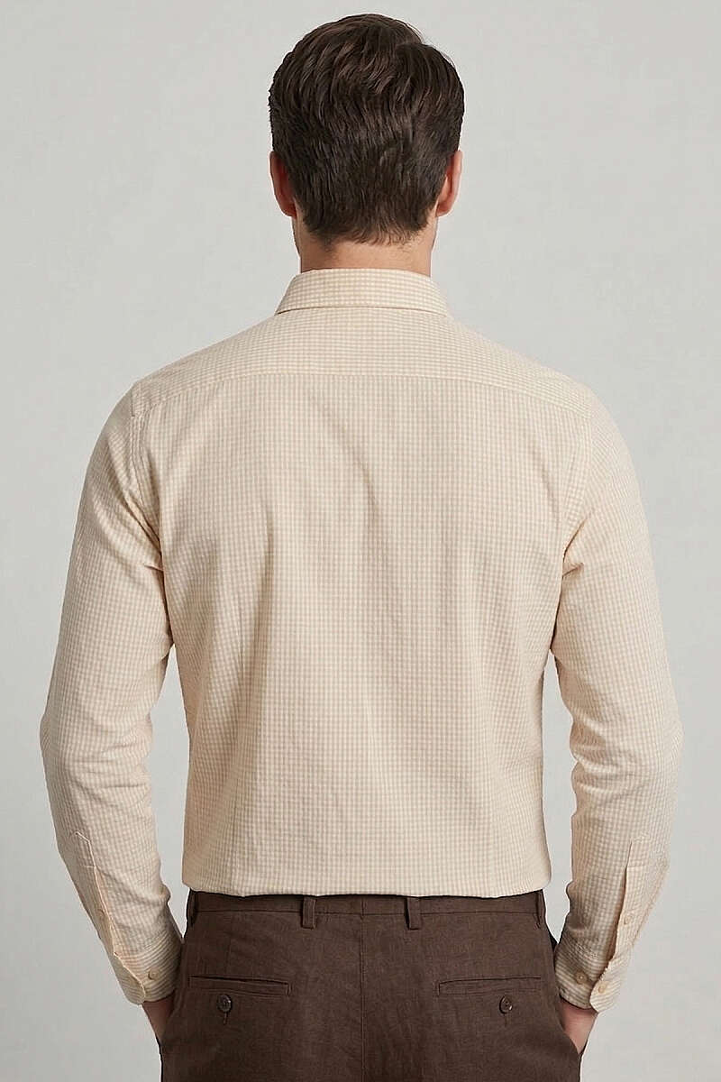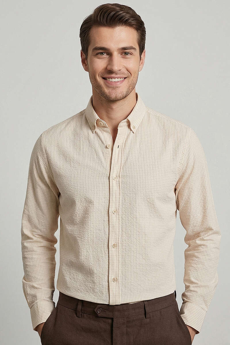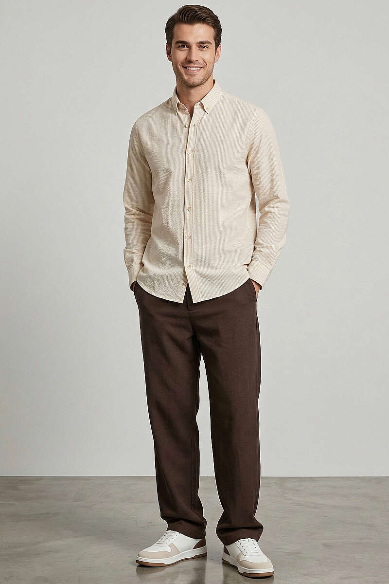 Manşet Düğmeli Çizgili Keten Erkek Gömlek Bej