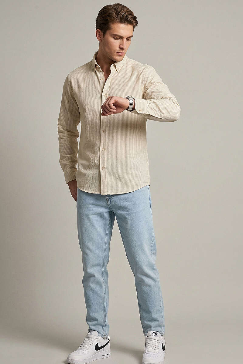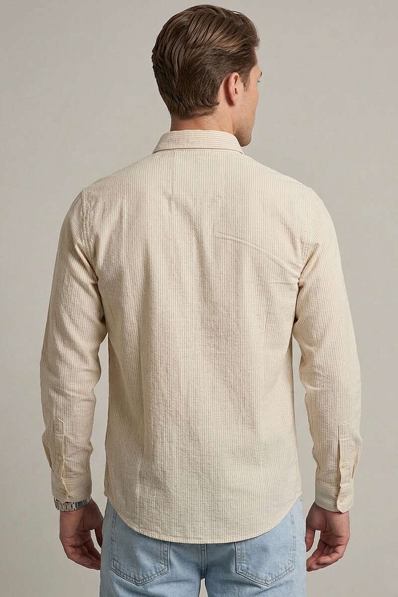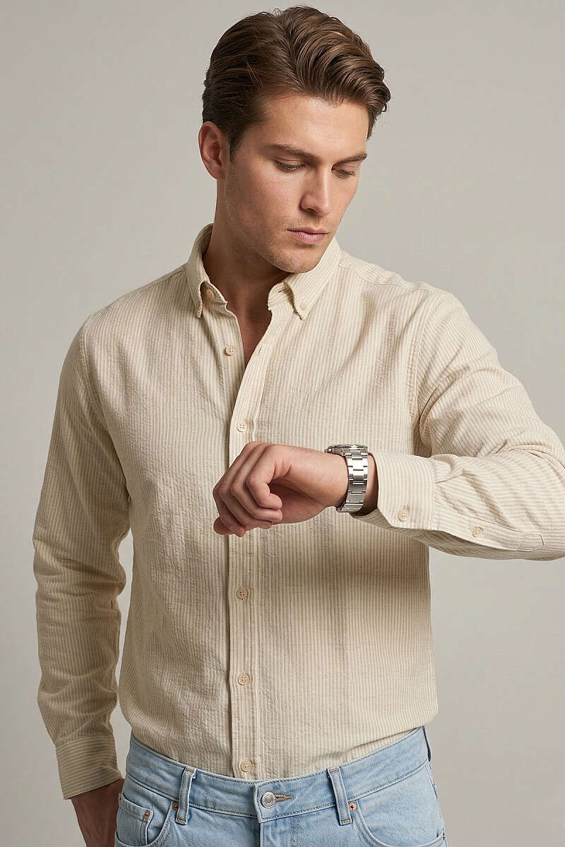 Manşet Düğmeli Çizgili Keten Erkek Gömlek Gri