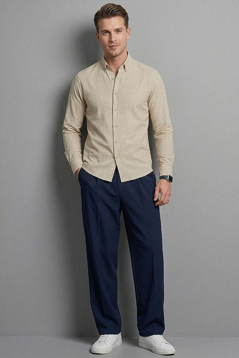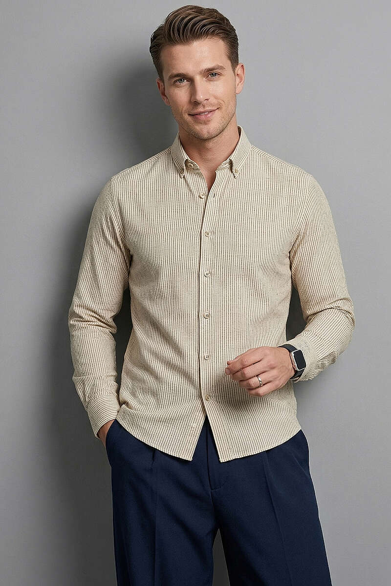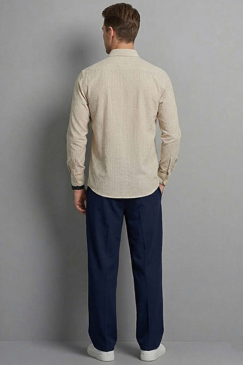Manşet Düğmeli Çizgili Keten Erkek Gömlek Lacivert