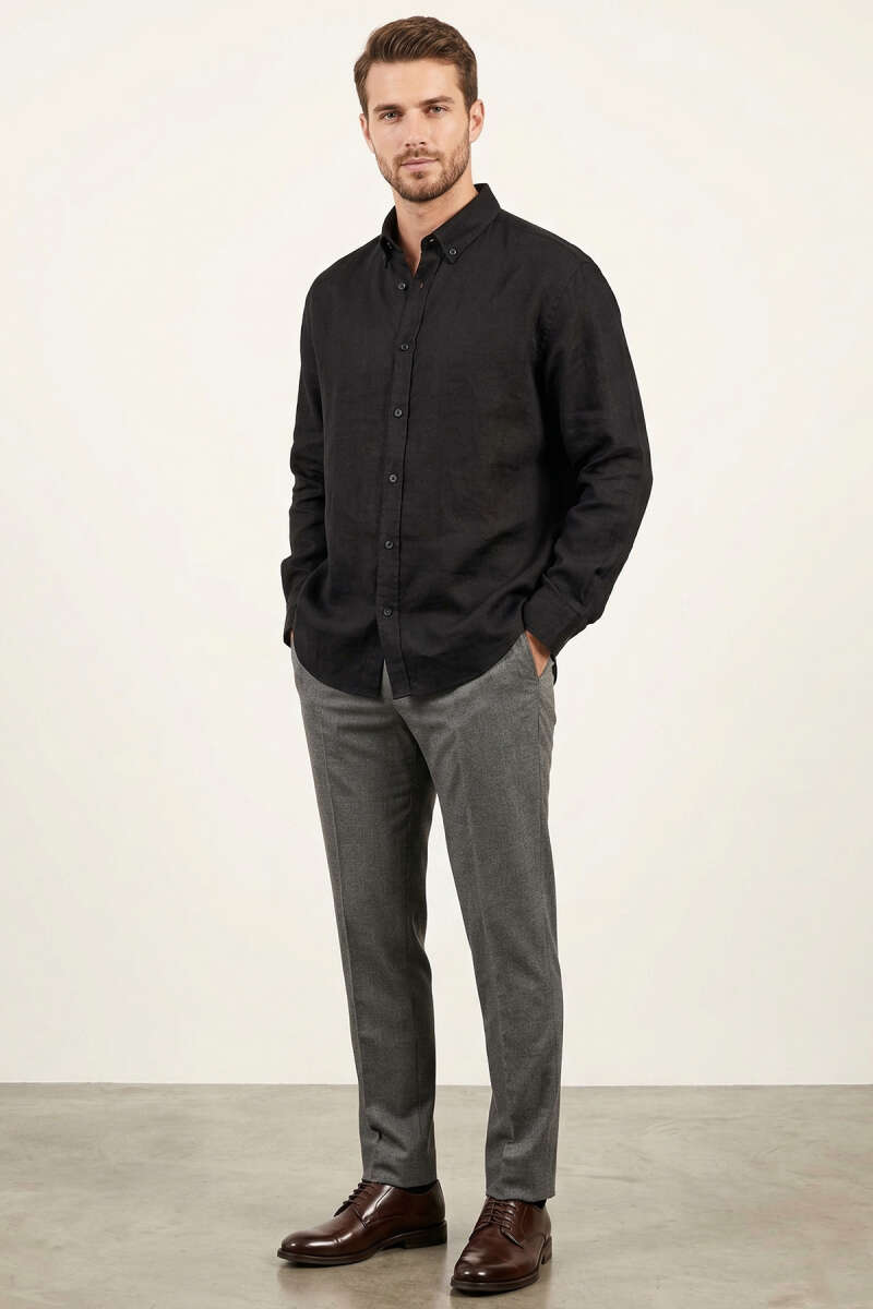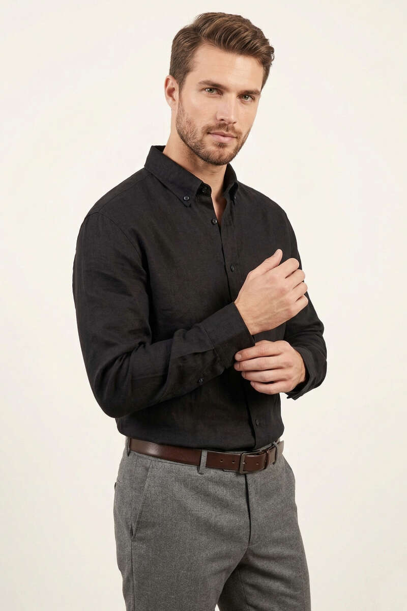 Manşet Düğmeli Keten Erkek Gömlek Siyah