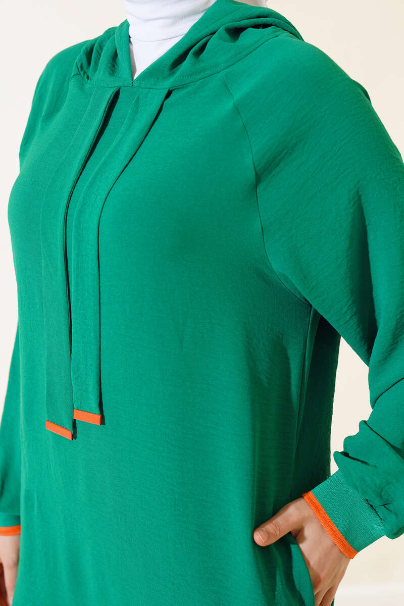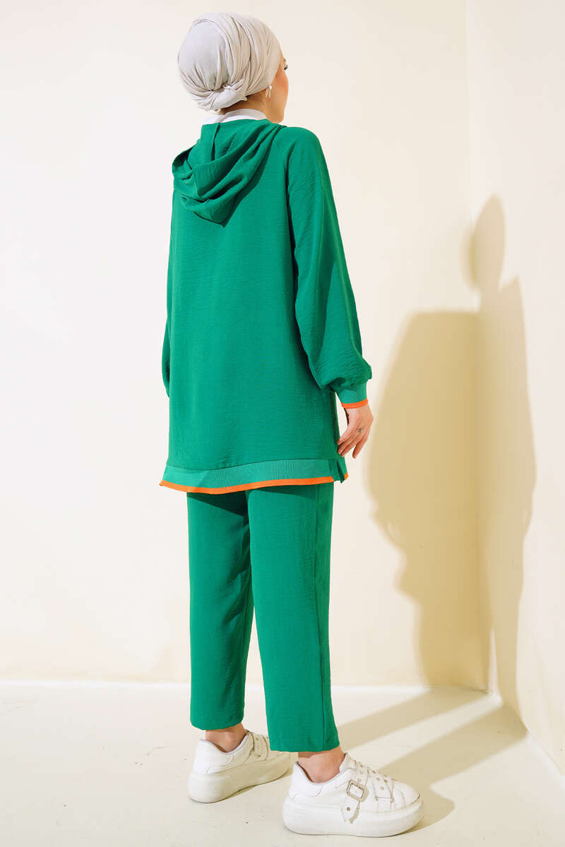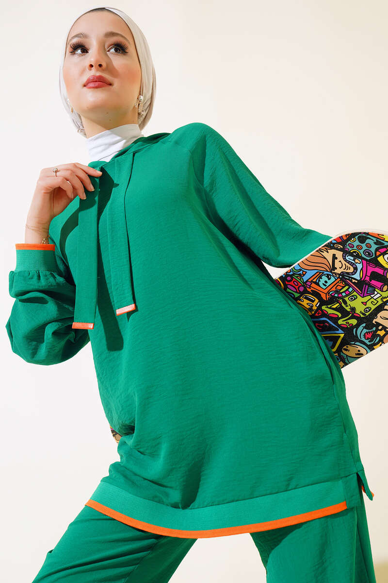 Yeni sezon ikili takım modelimizi çok seveceksiniz. Tuniğimiz kapüşonlu model olan tunik modelimiz salaştır. Kol bilekleri ribanalıdır. Oversize model olan tuniğimizin etek ucu manşet şeritlidir. İki adet yan cebi bulunmaktadır. Etek ucu yanlardan yırtmaçlıdır. Pantolonumuzun beli lastiklidir. Keten ikili takım modelimizin renk seçenekleri mevcuttur.